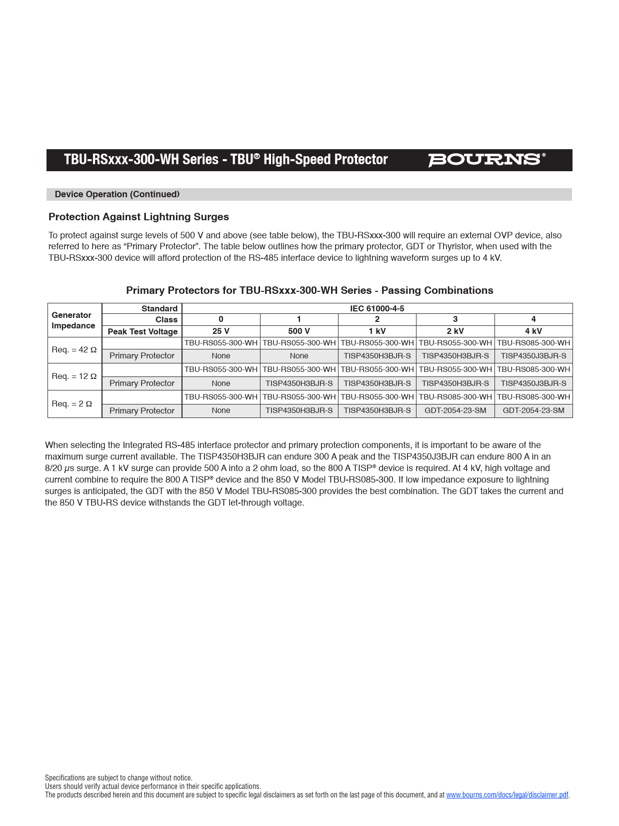 TBU-RS055-300-WH TBU-RS055-300-WH TBU-RS055-300-WH TBU-RS055-300-WH TBU-RS085-300-WH Req. = 42 Ω Primary Protector None None TISP4350H3BJR-S TISP4350H3BJR-S TISP4350J3BJR-S TBU-RS055-300-WH TBU-RS055-300-WH TBU-RS055-300-WH TBU-RS055-300-WH TBU-RS085-300-WH Req. = 12 Ω Primary Protector None TISP4350H3BJR-S TISP4350H3BJR-S TISP4350H3BJR-S TISP4350J3BJR-S TBU-RS055-300-WH TBU-RS055-300-WH TBU-RS055-300-WH TBU-RS085-300-WH TBU-RS085-300-WH Req. = 2 Ω Primary Protector None TISP4350H3BJR-S TISP4350H3BJR-S GDT-2054-23-SM GDT-2054-23-SM When selecting the Integrated RS-485 interface protector and primary protection components, it is important to be aware of the maximum surge current available. The TISP4350H3BJR can endure 300 A peak and the TISP4350J3BJR can endure 800 A in an 8/20 µs surge. A 1 kV surge can provide 500 A into a 2 ohm load, so the 800 A TISP® device is required. At 4 kV, high voltage and current combine to require the 800 A TISP® device and the 850 V Model TBU-RS085-300. If low impedance exposure to lightning surges is anticipated, the GDT with the 850 V Model TBU-RS085-300 provides the best combination. The GDT takes the current and the 850 V TBU-RS device withstands the GDT let-through voltage. Specifications are subject to change without notice. Users should verify actual device performance in their specific applications. The products described herein and this document are subject to specific legal disclaimers as set forth on the last page of this document, and at www.bourns.com/docs/legal/disclaimer.pdf.