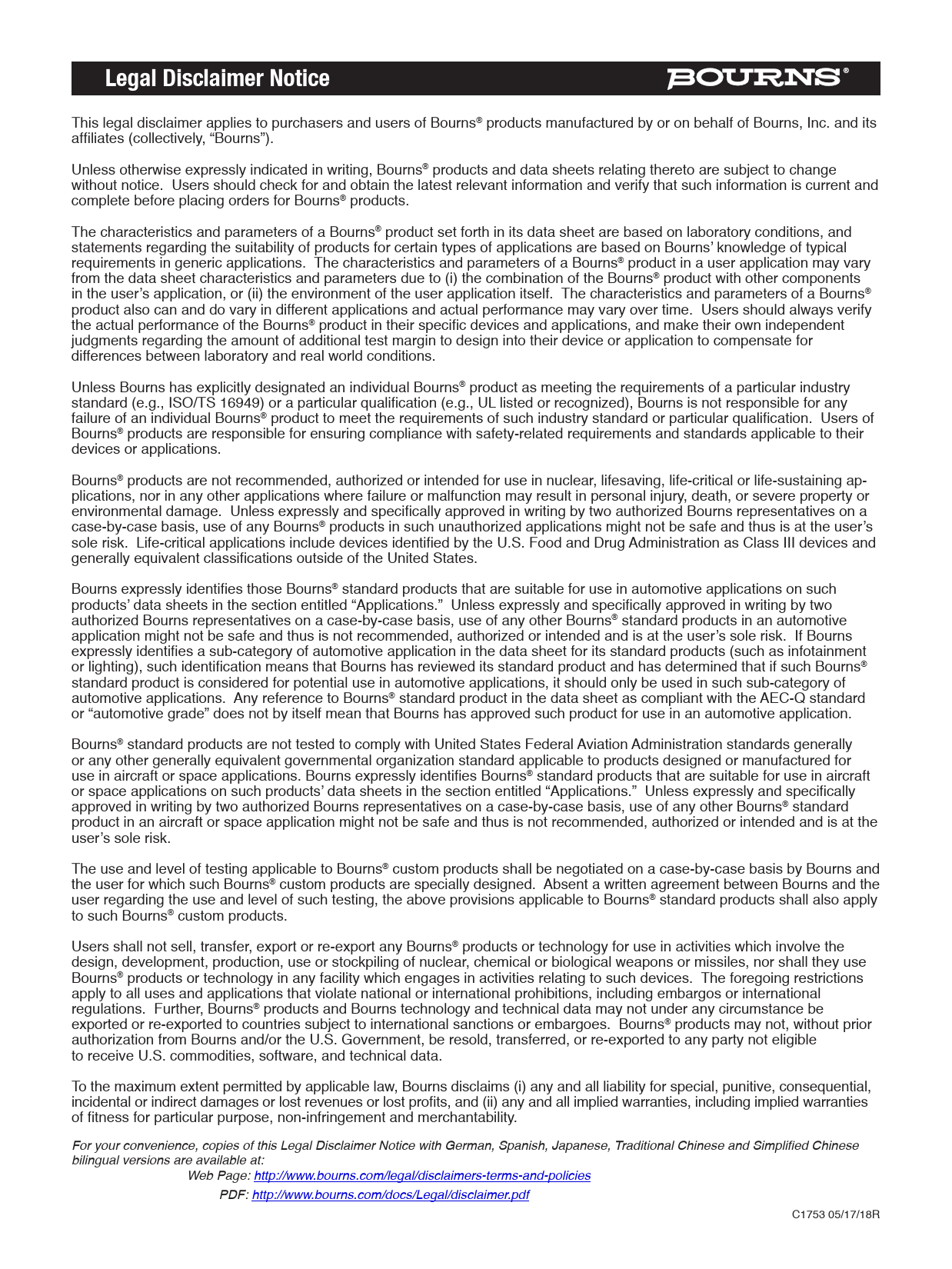 This legal disclaimer applies to purchasers and users of Bourns® products manufactured by or on behalf of Bourns, Inc. and its affiliates (collectively, “Bourns”). Unless otherwise expressly indicated in writing, Bourns® products and data sheets relating thereto are subject to change without notice. Users should check for and obtain the latest relevant information and verify that such information is current and complete before placing orders for Bourns® products. The characteristics and parameters of a Bourns® product set forth in its data sheet are based on laboratory conditions, and statements regarding the suitability of products for certain types of applications are based on Bourns’ knowledge of typical requirements in generic applications. The characteristics and parameters of a Bourns® product in a user application may vary from the data sheet characteristics and parameters due to (i) the combination of the Bourns® product with other components in the user’s application, or (ii) the environment of the user application itself. The characteristics and parameters of a Bourns® product also can and do vary in different applications and actual performance may vary over time. Users should always verify the actual performance of the Bourns® product in their specific devices and applications, and make their own independent judgments regarding the amount of additional test margin to design into their device or application to compensate for differences between laboratory and real world conditions. Unless Bourns has explicitly designated an individual Bourns® product as meeting the requirements of a particular industry standard (e.g., ISO/TS 16949) or a particular qualification (e.g., UL listed or recognized), Bourns is not responsible for any failure of an individual Bourns® product to meet the requirements of such industry standard or particular qualification. Users of Bourns® products are responsible for ensuring compliance with safety-related requirements and standards applicable to their devices or applications. Bourns® products are not recommended, authorized or intended for use in nuclear, lifesaving, life-critical or life-sustaining ap- plications, nor in any other applications where failure or malfunction may result in personal injury, death, or severe property or environmental damage. Unless expressly and specifically approved in writing by two authorized Bourns representatives on a case-by-case basis, use of any Bourns® products in such unauthorized applications might not be safe and thus is at the user’s sole risk. Life-critical applications include devices identified by the U.S. Food and Drug Administration as Class III devices and generally equivalent classifications outside of the United States. Bourns expressly identifies those Bourns® standard products that are suitable for use in automotive applications on such products’ data sheets in the section entitled “Applications.” Unless expressly and specifically approved in writing by two authorized Bourns representatives on a case-by-case basis, use of any other Bourns® standard products in an automotive application might not be safe and thus is not recommended, authorized or intended and is at the user’s sole risk. If Bourns expressly identifies a sub-category of automotive application in the data sheet for its standard products (such as infotainment or lighting), such identification means that Bourns has reviewed its standard product and has determined that if such Bourns® standard product is considered for potential use in automotive applications, it should only be used in such sub-category of automotive applications. Any reference to Bourns® standard product in the data sheet as compliant with the AEC-Q standard or “automotive grade” does not by itself mean that Bourns has approved such product for use in an automotive application. Bourns® standard products are not tested to comply with United States Federal Aviation Administration standards generally or any other generally equivalent governmental organization standard applicable to products designed or manufactured for use in aircraft or space applications. Bourns expressly identifies Bourns® standard products that are suitable for use in aircraft or space applications on such products’ data sheets in the section entitled “Applications.” Unless expressly and specifically approved in writing by two authorized Bourns representatives on a case-by-case basis, use of any other Bourns® standard product in an aircraft or space application might not be safe and thus is not recommended, authorized or intended and is at the user’s sole risk. The use and level of testing applicable to Bourns® custom products shall be negotiated on a case-by-case basis by Bourns and the user for which such Bourns® custom products are specially designed. Absent a written agreement between Bourns and the user regarding the use and level of such testing, the above provisions applicable to Bourns® standard products shall also apply to such Bourns® custom products. Users shall not sell, transfer, export or re-export any Bourns® products or technology for use in activities which involve the design, development, production, use or stockpiling of nuclear, chemical or biological weapons or missiles, nor shall they use Bourns® products or technology in any facility which engages in activities relating to such devices. The foregoing restrictions apply to all uses and applications that violate national or international prohibitions, including embargos or international regulations. Further, Bourns® products and Bourns technology and technical data may not under any circumstance be exported or re-exported to countries subject to international sanctions or embargoes. Bourns® products may not, without prior authorization from Bourns and/or the U.S. Government, be resold, transferred, or re-exported to any party not eligible to receive U.S. commodities, software, a