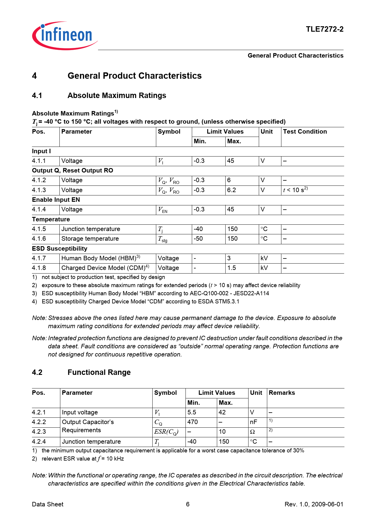 4.1.7 Human Body Model (HBM)3) Voltage - Voltage - 3 kV – 4.1.8 Charged Device Model (CDM)4) 1.5 kV – 1) not subject to production test, specified by design 2) exposure to these absolute maximum ratings for extended periods (t > 10 s) may affect device reliability 3) ESD susceptibility Human Body Model “HBM” according to AEC-Q100-002 - JESD22-A114 4) ESD susceptibility Charged Device Model “CDM” according to ESDA STM5.3.1 Note: Stresses above the ones listed here may cause permanent damage to the device. Exposure to absolute maximum rating conditions for extended periods may affect device reliability. Note: Integrated protection functions are designed to prevent IC destruction under fault conditions described in the data sheet. Fault conditions are considered as “outside” normal operating range. Protection functions are not designed for continuous repetitive operation.