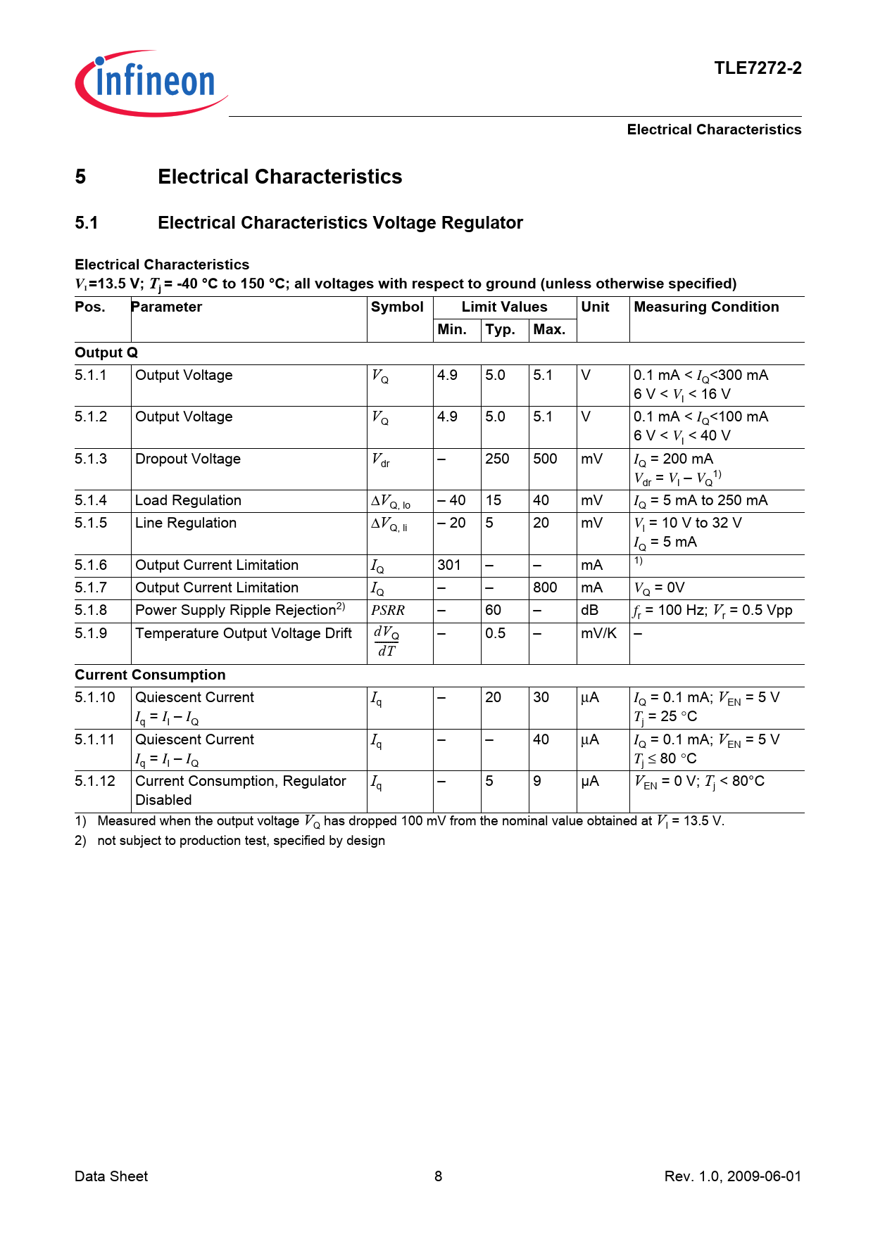 5.1.1 Output Voltage VQ 4.9 5.0 5.1 V 0.1 mA < IQ<300 mA 6 V < VI < 16 V 5.1.2 Output Voltage VQ 4.9 5.0 5.1 V 0.1 mA < IQ<100 mA 6 V < VI < 40 V 5.1.3 Dropout Voltage Vdr – 250 500 mV IQ = 200 mA V 1) dr = VI – VQ 5.1.4 Load Regulation ∆VQ, lo – 40 15 40 mV IQ = 5 mA to 250 mA 5.1.5 Line Regulation ∆VQ, li – 20 5 20 mV Vl = 10 V to 32 V IQ = 5 mA 5.1.6 Output Current Limitation IQ 301 – – mA 1) 5.1.7 Output Current Limitation IQ – – 800 mA V PSRR – dV Q = 0V 5.1.8 Power Supply Ripple Rejection2) 60 – dB fr = 100 Hz; Vr = 0.5 Vpp 5.1.9 Temperature Output Voltage Drift Q – 0.5 – mV/K – ------ dT