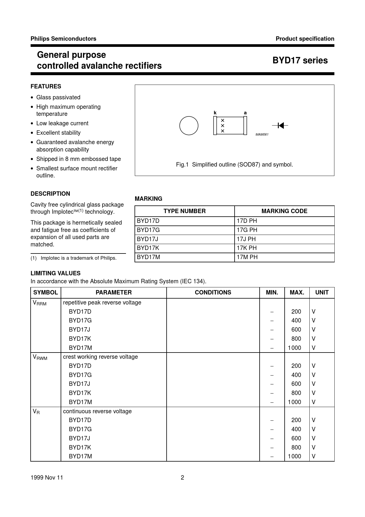 VRRM repetitive peak reverse voltage BYD17D − 200 V BYD17G − 400 V BYD17J − 600 V BYD17K − 800 V BYD17M − 1000 V VRWM crest working reverse voltage BYD17D − 200 V BYD17G − 400 V BYD17J − 600 V BYD17K − 800 V BYD17M − 1000 V VR continuous reverse voltage BYD17D − 200 V BYD17G − 400 V BYD17J − 600 V BYD17K − 800 V BYD17M − 1000 V 1999 Nov 11 2