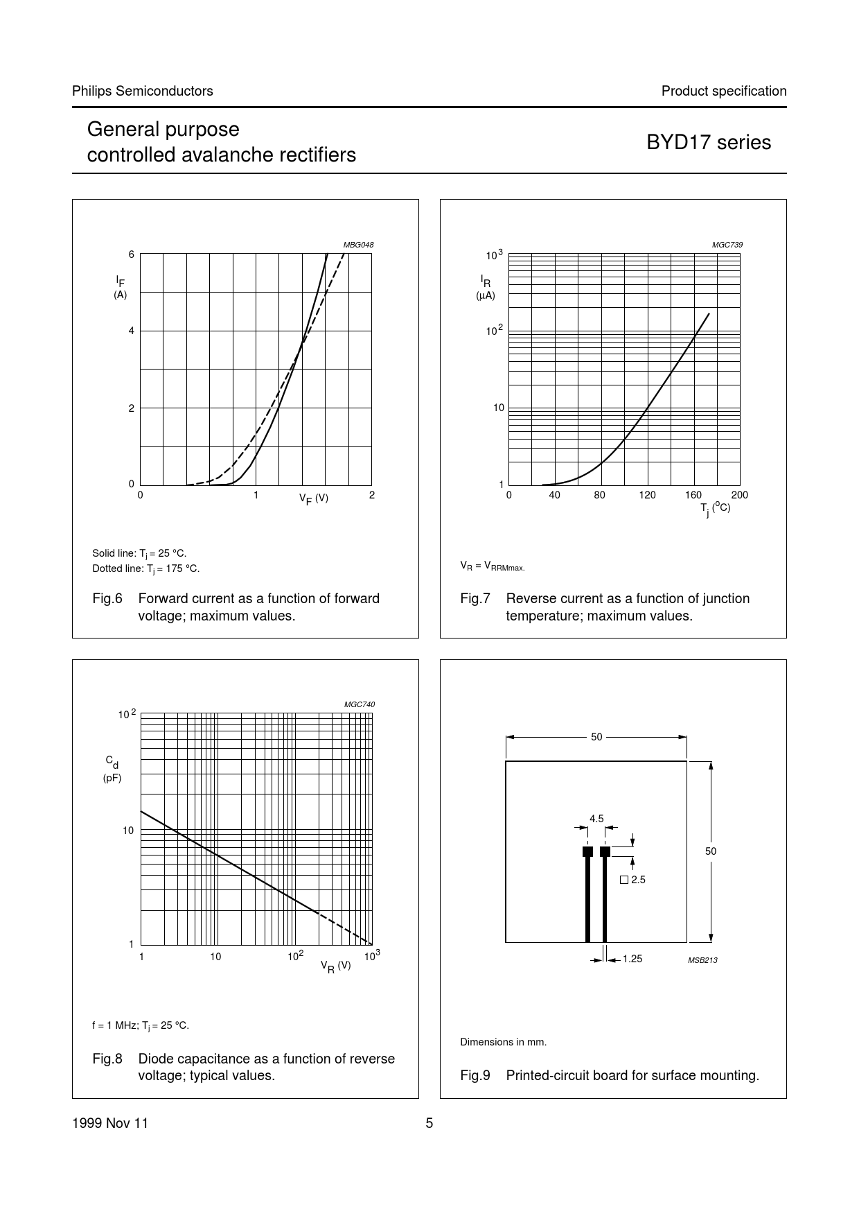 Philips Semiconductors Product specification General purpose BYD17 series controlled avalanche rectifiers MBG048 MGC739 6 10 3 handbook, halfpage handbook, halfpage I I F R (A) (µA) 4 10 2 2 10 0 1 0 1 2 V 0 40 80 120 160 200 F (V) T (oC) j Solid line: Tj = 25 °C. Dotted line: T V j = 175 °C. R = VRRMmax. Fig.6 Forward current as a function of forward Fig.7 Reverse current as a function of junction voltage; maximum values. temperature; maximum values. MGC740 10 2 handbook, halfpage 50 Cd (pF) 4.5 10 50 2.5 1 1 10 102 103 1.25 V (V) MSB213 R f = 1 MHz; Tj = 25 °C. Dimensions in mm. Fig.8 Diode capacitance as a function of reverse voltage; typical values. Fig.9 Printed-circuit board for surface mounting. 1999 Nov 11 5