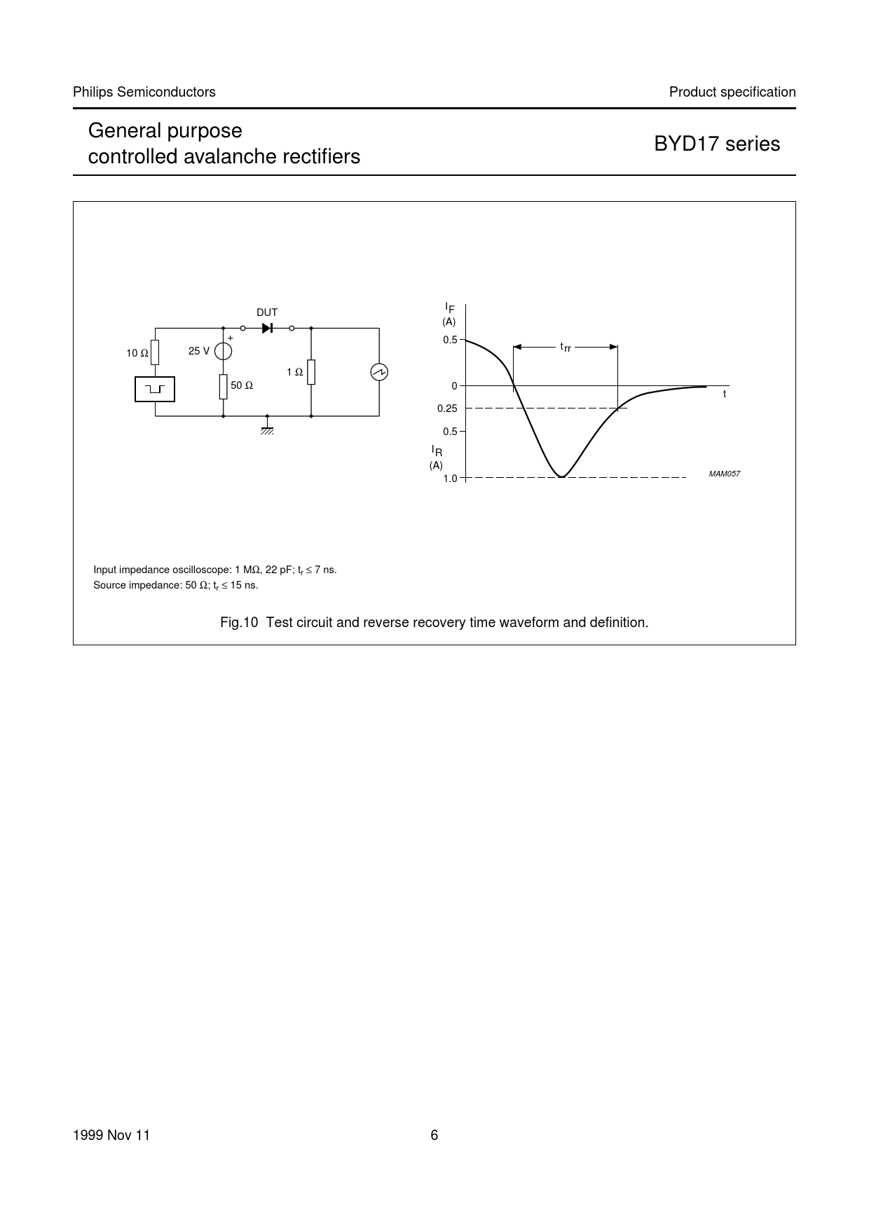 Philips Semiconductors Product specification General purpose BYD17 series controlled avalanche rectifiers I handbook, full pagewidth DUT F (A) + 0.5 t rr 10 Ω 25 V 1 Ω 50 Ω 0 t 0.25 0.5 IR (A) MAM057 1.0 Input impedance oscilloscope: 1 MΩ, 22 pF; tr ≤ 7 ns. Source impedance: 50 Ω; tr ≤ 15 ns. Fig.10 Test circuit and reverse recovery time waveform and definition. 1999 Nov 11 6