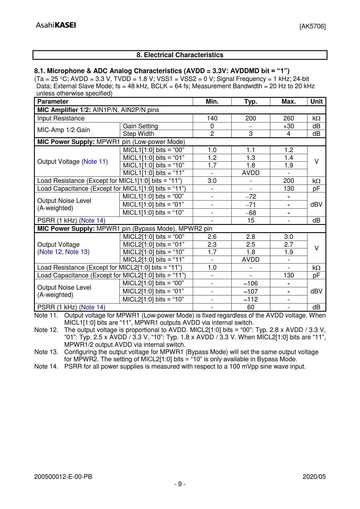 8. Electrical Characteristics 8.1. Microphone & ADC Analog Characteristics (AVDD = 3.3V: AVDDMD bit = “1”)