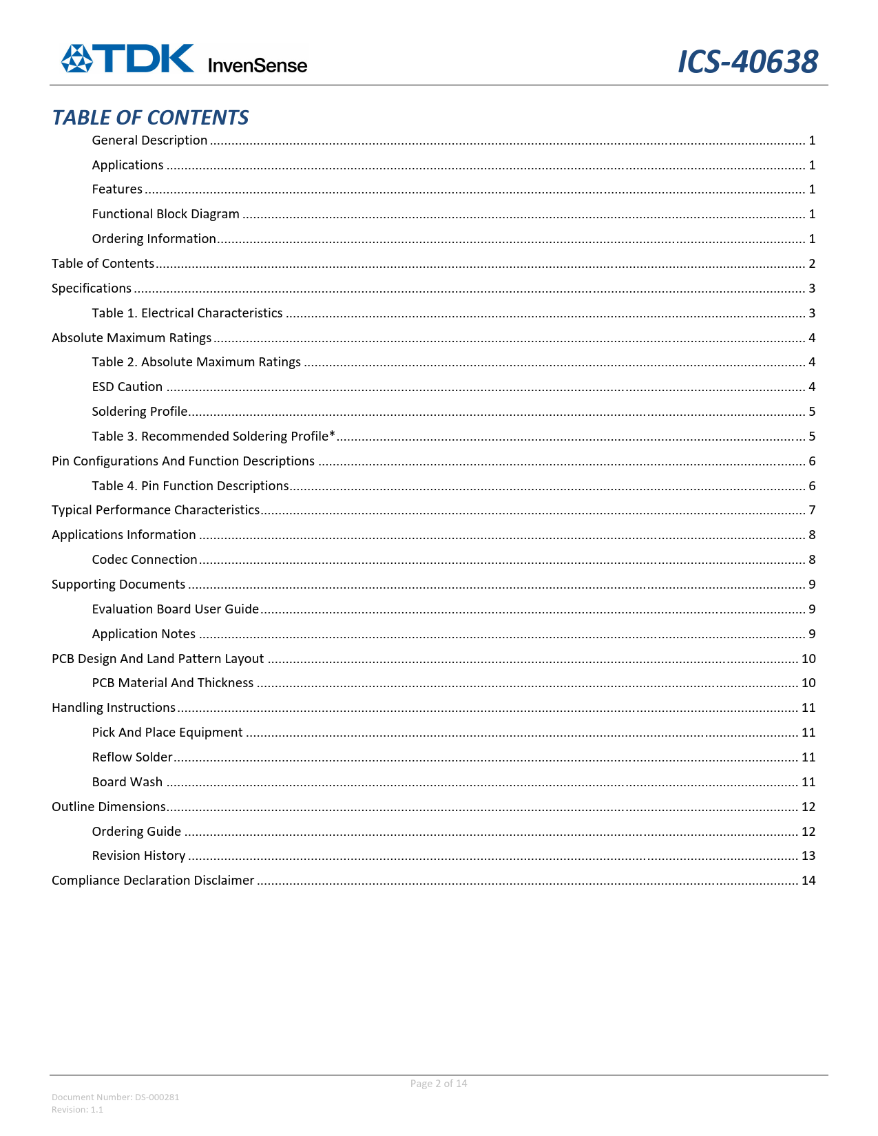 General Description ... 1 Applications ... 1 Features ... 1 Functional Block Diagram .. 1 Ordering Information ... 1 Table of Contents .. 2 Specifications .. 3 Table 1. Electrical Characteristics .. 3 Absolute Maximum Ratings .. 4 Table 2. Absolute Maximum Ratings ... 4 ESD Caution ... 4 Soldering Profile ... 5 Table 3. Recommended Soldering Profile* .. 5 Pin Configurations And Function Descriptions ... 6 Table 4. Pin Function Descriptions ... 6 Typical Performance Characteristics ... 7 Applications Information .. 8 Codec Connection .. 8 Supporting Documents ... 9 Evaluation Board User Guide ... 9 Application Notes .. 9 PCB Design And Land Pattern Layout ... 10 PCB Material And Thickness .. 10 Handling Instructions .. 11 Pick And Place Equipment ... 11 Reflow Solder ... 11 Board Wash ... 11 Outline Dimensions ... 12 Ordering Guide .. 12 Revision History ... 13 Compliance Declaration Disclaimer .. 14 Page 2 of 14 Document Number: DS‐000281 Revision: 1.1