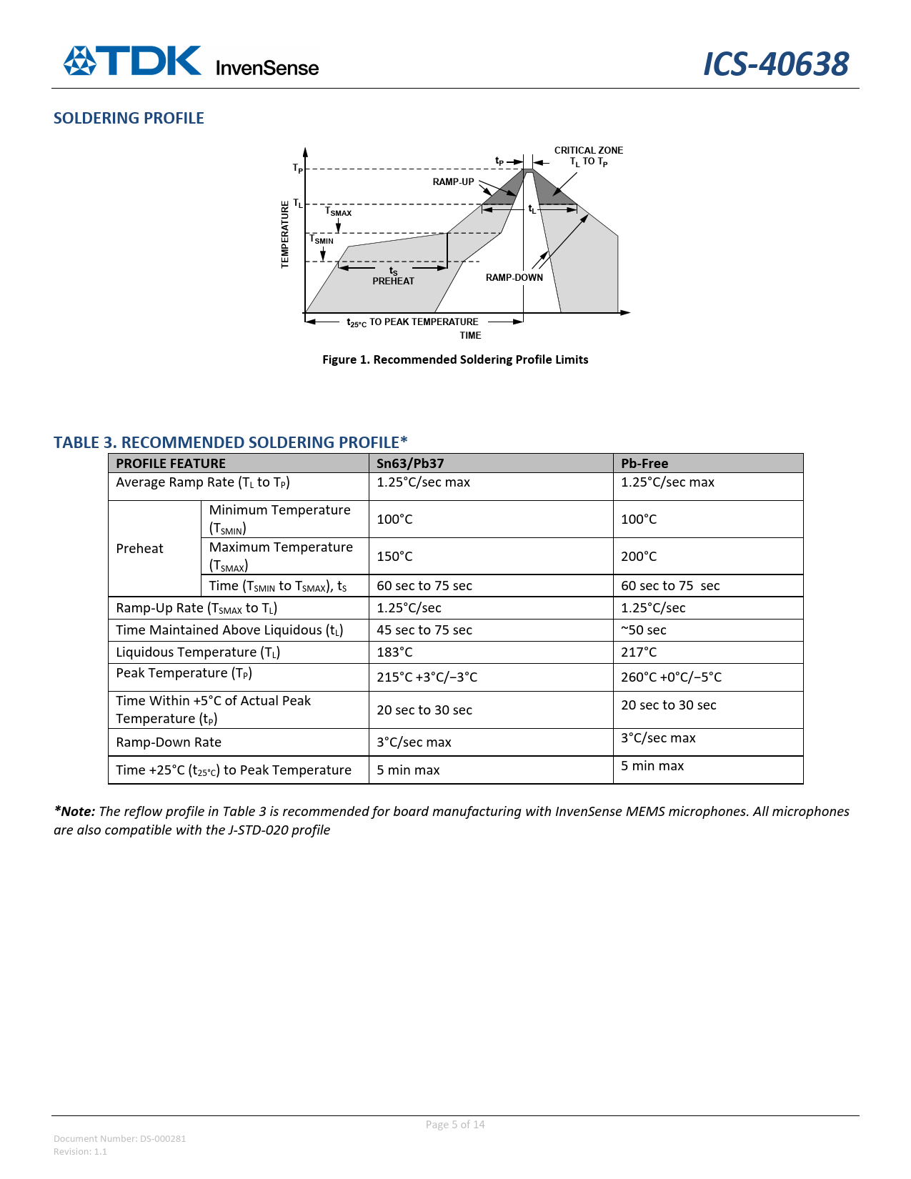 The reflow profile in Table 3 is recommended for board manufacturing with InvenSense MEMS microphones. All microphones  are also compatible with the J‐STD‐020 profile    Page 5 of 14  Document Number: DS‐000281  Revision: 1.1