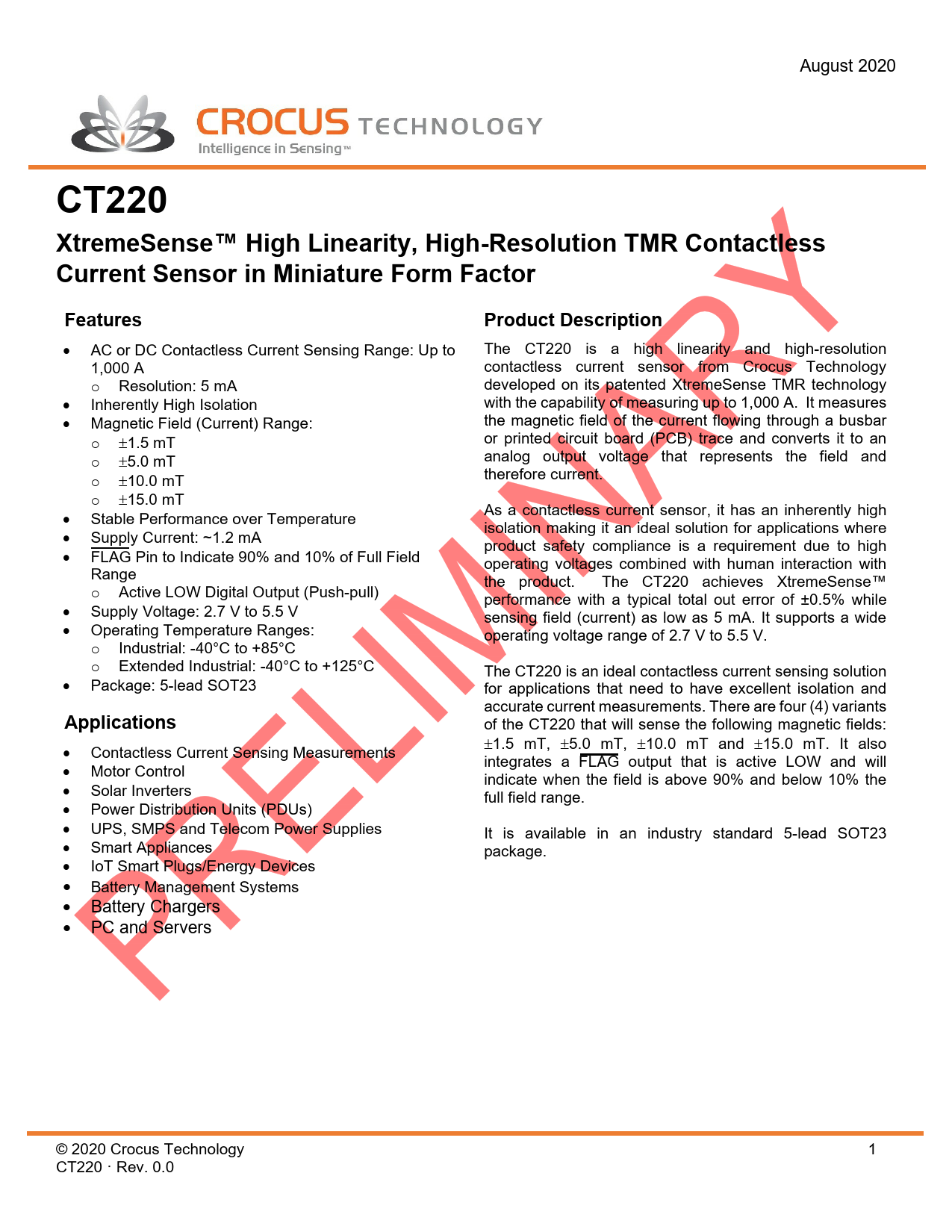 August 2020 CT220 XtremeSense™ High Linearity, High-Resolution TMR Contactless