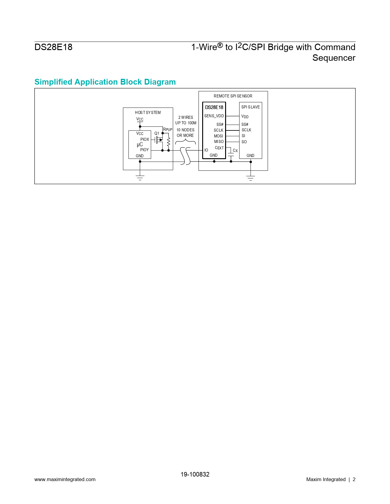 REMOTE SPI SE NSOR DS28E18 SPI S LAVE HOS T SY STEM SENS_VDD V V 2 W IRES DD CC UP TO 100M SS# SS# RPUP 10 NODES SCLK SCLK VCC Q1 OR MORE MOSI SI PIOX μC MISO SO PIOY CEXT IO CX GND GND GND 19-100832 www.maximintegrated.com Maxim Integrated | 2 Document Outline General Description Applications Benefits and Features Simplified Application Block Diagram Absolute Maximum Ratings Package Information 8 TDFN-EP Electrical Characteristics Electrical Characteristics (continued) Typical Operating Characteristics Pin Configuration DS28E18 Pin Description Functional Diagram Block Diagram Detailed Description 64-Bit ROM ID Power-Up ROM ID Serialization 1-Wire Bus System Hardware Configuration Transaction Sequence Initialization 1-Wire ROM Function Commands Search ROM [F0h] Read ROM [33h] Match ROM [55h] Skip ROM [CCh] Resume [A5h] Overdrive-Skip ROM [3Ch] Overdrive-Match ROM [69h] 1-Wire Signaling and Timing Read/Write Time Slots Master-to-Slave Slave-to-Master Improved Network Behavior Device Function Commands Command Start (66h) Write Sequencer Command (11h) Read Sequencer Command (22h) Run Sequencer Command (33h) Device Configuration and Status Commands Write Configuration Command (55h) Read Configuration Command (6Ah) Write GPIO Configuration (83h) Read GPIO Configuration (7Ch) Device Status Command (7Ah) Sequencer Commands I2C Sequencer Interface Commands I2C Start Command I2C Stop Command I2C Write Data Command I2C Read Data Command I2C Read Data with NACK End Command SPI Sequencer Commands SPI Write/Read Byte(s) Command SPI Write/Read Bit(s) Command SS_HIGH Command SS_LOW Command Sequencer Utility Commands GPIO_CTRL Write Command GPIO_CTRL Read Command GPIO_BUF Write Command GPIO_BUF Read Command Delay Command SENS_VDD On Command SENS_VDD Off Command I2C Overview I2C Definitions Bus Idle or Not Busy START Condition STOP Condition Repeated START Condition Data Valid SPI Overview SPI Timing SPI Timing Diagram Power-Up of GPIO/I2C Pins Timeout Typical Application Circuits DS28E18 Configured as an I2C Master Typical Application Circuits (continued) DS28E18 Configured as an SPI Master Ordering Information Revision History