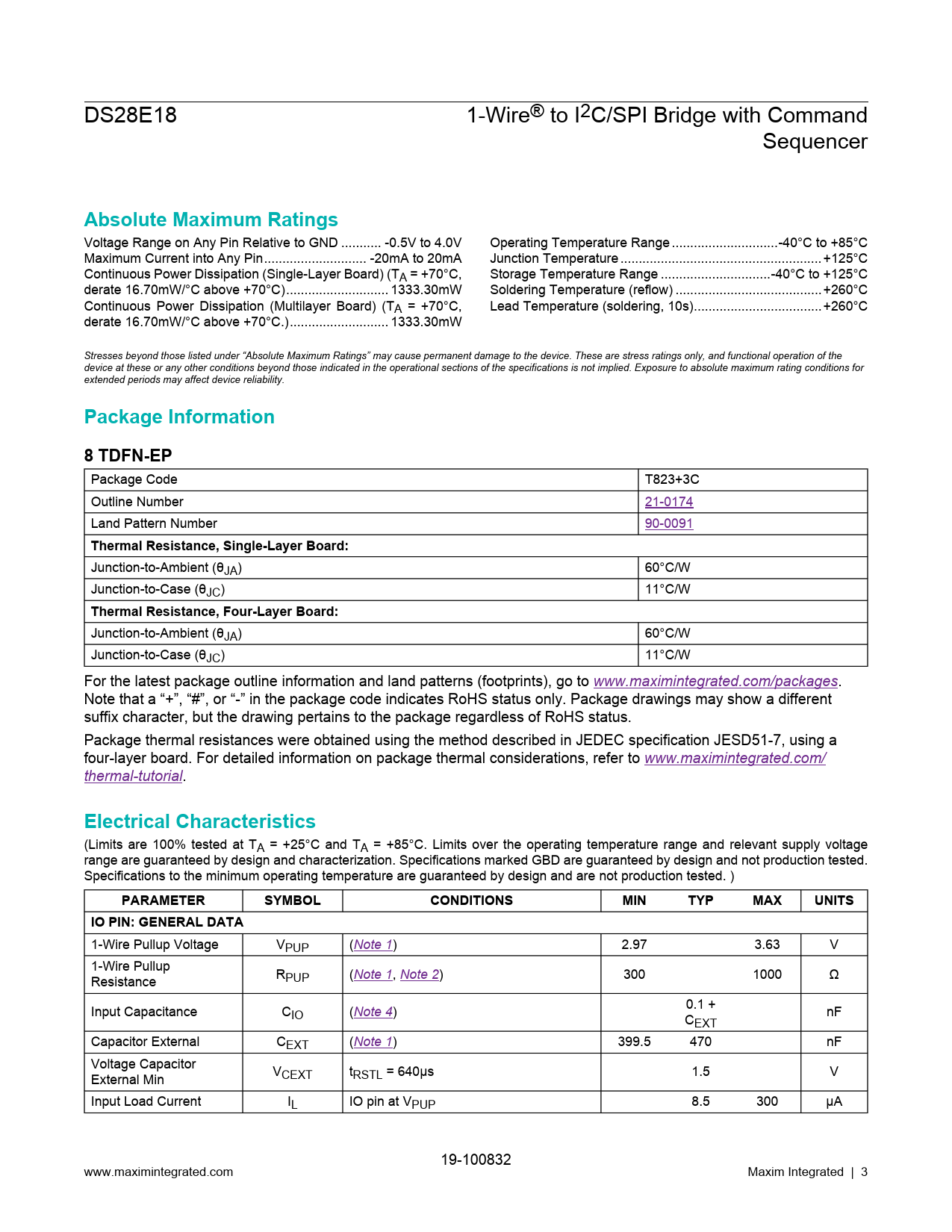 link to page 7 link to page 7 link to page 7 link to page 7 link to page 7 DS28E18 1-Wire® to I2C/SPI Bridge with Command Sequencer Absolute Maximum Ratings Voltage Range on Any Pin Relative to GND ... -0.5V to 4.0V Operating Temperature Range ...-40°C to +85°C Maximum Current into Any Pin.. -20mA to 20mA Junction Temperature ... +125°C Continuous Power Dissipation (Single-Layer Board) (TA = +70°C, Storage Temperature Range ..-40°C to +125°C derate 16.70mW/°C above +70°C).. 1333.30mW Soldering Temperature (reflow) ..+260°C Continuous Power Dissipation (Multilayer Board) (TA = +70°C, Lead Temperature (soldering, 10s)...+260°C derate 16.70mW/°C above +70°C.)... 1333.30mW Stresses beyond those listed under “Absolute Maximum Ratings” may cause permanent damage to the device. These are stress ratings only, and functional operation of the device at these or any other conditions beyond those indicated in the operational sections of the specifications is not implied. Exposure to absolute maximum rating conditions for extended periods may affect device reliability. Package Information8 TDFN-EP Package Code T823+3C Outline Number 21-0174 Land Pattern Number 90-0091 Thermal Resistance, Single-Layer Board: Junction-to-Ambient (θJA) 60°C/W Junction-to-Case (θJC) 11°C/W Thermal Resistance, Four-Layer Board: Junction-to-Ambient (θJA) 60°C/W Junction-to-Case (θJC) 11°C/W For the latest package outline information and land patterns (footprints), go to www.maximintegrated.com/packages. Note that a “+”, “#”, or “-” in the package code indicates RoHS status only. Package drawings may show a different suffix character, but the drawing pertains to the package regardless of RoHS status. Package thermal resistances were obtained using the method described in JEDEC specification JESD51-7, using a four-layer board. For detailed information on package thermal considerations, refer to www.maximintegrated.com/ thermal-tutorial. Electrical Characteristics (Limits are 100% tested at TA = +25°C and TA = +85°C. Limits over the operating temperature range and relevant supply voltage range are guaranteed by design and characterization. Specifications marked GBD are guaranteed by design and not production tested. Specifications to the minimum operating temperature are guaranteed by design and are not production tested. ) PARAMETERSYMBOLCONDITIONSMINTYPMAXUNITSIO PIN: GENERAL DATA 1-Wire Pullup Voltage VPUP (Note 1) 2.97 3.63 V 1-Wire Pullup R Resistance PUP (Note 1, Note 2) 300 1000 Ω 0.1 + Input Capacitance CIO (Note 4) nF CEXT Capacitor External CEXT (Note 1) 399.5 470 nF Voltage Capacitor V External Min CEXT tRSTL = 640μs 1.5 V Input Load Current IL IO pin at VPUP 8.5 300 μA 19-100832 www.maximintegrated.com Maxim Integrated | 3 Document Outline General Description Applications Benefits and Features Simplified Application Block Diagram Absolute Maximum Ratings Package Information 8 TDFN-EP Electrical Characteristics Electrical Characteristics (continued) Typical Operating Characteristics Pin Configuration DS28E18 Pin Description Functional Diagram Block Diagram Detailed Description 64-Bit ROM ID Power-Up ROM ID Serialization 1-Wire Bus System Hardware Configuration Transaction Sequence Initialization 1-Wire ROM Function Commands Search ROM [F0h] Read ROM [33h] Match ROM [55h] Skip ROM [CCh] Resume [A5h] Overdrive-Skip ROM [3Ch] Overdrive-Match ROM [69h] 1-Wire Signaling and Timing Read/Write Time Slots Master-to-Slave Slave-to-Master Improved Network Behavior Device Function Commands Command Start (66h) Write Sequencer Command (11h) Read Sequencer Command (22h) Run Sequencer Command (33h) Device Configuration and Status Commands Write Configuration Command (55h) Read Configuration Command (6Ah) Write GPIO Configuration (83h) Read GPIO Configuration (7Ch) Device Status Command (7Ah) Sequencer Commands I2C Sequencer Interface Commands I2C Start Command I2C Stop Command I2C Write Data Command I2C Read Data Command I2C Read Data with NACK End Command SPI Sequencer Commands SPI Write/Read Byte(s) Command SPI Write/Read Bit(s) Command SS_HIGH Command SS_LOW Command Sequencer Utility Commands GPIO_CTRL Write Command GPIO_CTRL Read Command GPIO_BUF Write Command GPIO_BUF Read Command Delay Command SENS_VDD On Command SENS_VDD Off Command I2C Overview I2C Definitions Bus Idle or Not Busy START Condition STOP Condition Repeated START Condition Data Valid SPI Overview SPI Timing SPI Timing Diagram Power-Up of GPIO/I2C Pins Timeout Typical Application Circuits DS28E18 Configured as an I2C Master Typical Application Circuits (continued) DS28E18 Configured as an SPI Master Ordering Information Revision History