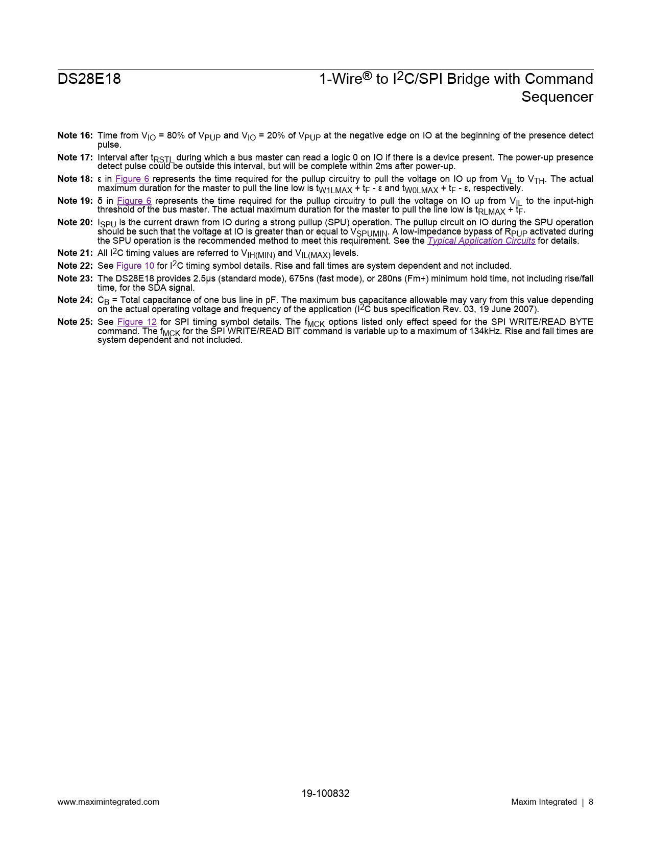 See Figure 12 for SPI timing symbol details. The fMCK options listed only effect speed for the SPI WRITE/READ BYTE command. The fMCK for the SPI WRITE/READ BIT command is variable up to a maximum of 134kHz. Rise and fall times are system dependent and not included. 19-100832 www.maximintegrated.com Maxim Integrated | 8 Document Outline General Description Applications Benefits and Features Simplified Application Block Diagram Absolute Maximum Ratings Package Information 8 TDFN-EP Electrical Characteristics Electrical Characteristics (continued) Typical Operating Characteristics Pin Configuration DS28E18 Pin Description Functional Diagram Block Diagram Detailed Description 64-Bit ROM ID Power-Up ROM ID Serialization 1-Wire Bus System Hardware Configuration Transaction Sequence Initialization 1-Wire ROM Function Commands Search ROM [F0h] Read ROM [33h] Match ROM [55h] Skip ROM [CCh] Resume [A5h] Overdrive-Skip ROM [3Ch] Overdrive-Match ROM [69h] 1-Wire Signaling and Timing Read/Write Time Slots Master-to-Slave Slave-to-Master Improved Network Behavior Device Function Commands Command Start (66h) Write Sequencer Command (11h) Read Sequencer Command (22h) Run Sequencer Command (33h) Device Configuration and Status Commands Write Configuration Command (55h) Read Configuration Command (6Ah) Write GPIO Configuration (83h) Read GPIO Configuration (7Ch) Device Status Command (7Ah) Sequencer Commands I2C Sequencer Interface Commands I2C Start Command I2C Stop Command I2C Write Data Command I2C Read Data Command I2C Read Data with NACK End Command SPI Sequencer Commands SPI Write/Read Byte(s) Command SPI Write/Read Bit(s) Command SS_HIGH Command SS_LOW Command Sequencer Utility Commands GPIO_CTRL Write Command GPIO_CTRL Read Command GPIO_BUF Write Command GPIO_BUF Read Command Delay Command SENS_VDD On Command SENS_VDD Off Command I2C Overview I2C Definitions Bus Idle or Not Busy START Condition STOP Condition Repeated START Condition Data Valid SPI Overview SPI Timing SPI Timing Diagram Power-Up of GPIO/I2C Pins Timeout Typical Application Circuits DS28E18 Configured as an I2C Master Typical Application Circuits (continued) DS28E18 Configured as an SPI Master Ordering Information Revision History