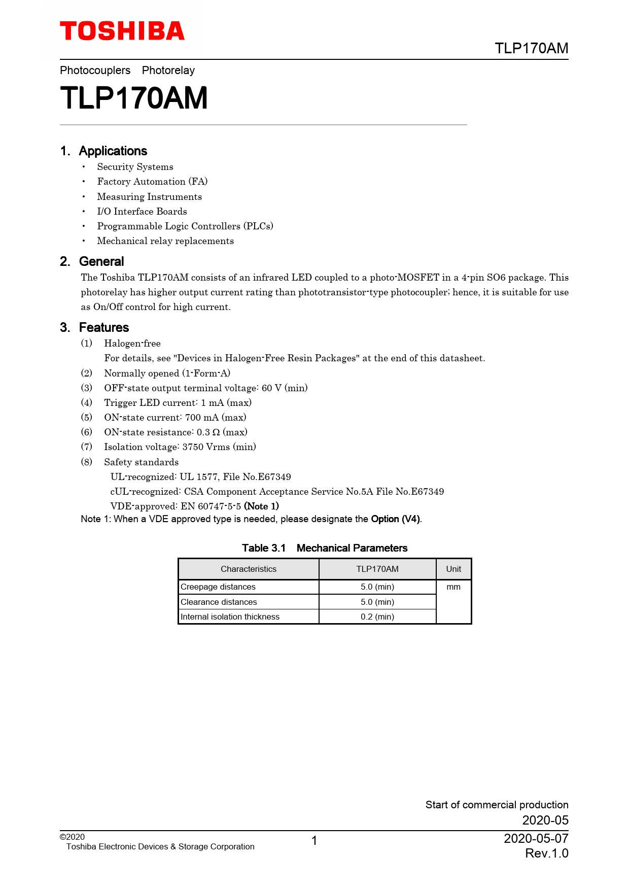 TLP170AM Photocouplers Photorelay TLP170AM 1. Applications • Security Systems • Factory Automation (FA) • Measuring Instruments • I/O Interface Boards • Programmable Logic Controllers (PLCs) • Mechanical relay replacements 2. General The Toshiba TLP170AM consists of an infrared LED coupled to a photo-MOSFET in a 4-pin SO6 package. This photorelay has higher output current rating than phototransistor-type photocoupler; hence, it is suitable for use as On/Off control for high current. 3. Features (1) Halogen-free For details, see "Devices in Halogen-Free Resin Packages" at the end of this datasheet. (2) Normally opened (1-Form-A) (3) OFF-state output terminal voltage: 60 V (min) (4) Trigger LED current: 1 mA (max) (5) ON-state current: 700 mA (max) (6) ON-state resistance: 0.3 Ω (max) (7) Isolation voltage: 3750 Vrms (min) (8) Safety standards UL-recognized: UL 1577, File No.E67349 cUL-recognized: CSA Component Acceptance Service No.5A File No.E67349 VDE-approved: EN 60747-5-5 (Note 1) Note 1: When a VDE approved type is needed, please designate the Option (V4). Table 3.1 Mechanical Parameters Characteristics TLP170AM Unit Creepage distances 5.0 (min) mm Clearance distances 5.0 (min) Internal isolation thickness 0.2 (min) Start of commercial production 2020-05 ©2020 1 2020-05-07 Toshiba Electronic Devices & Storage Corporation Rev.1.0