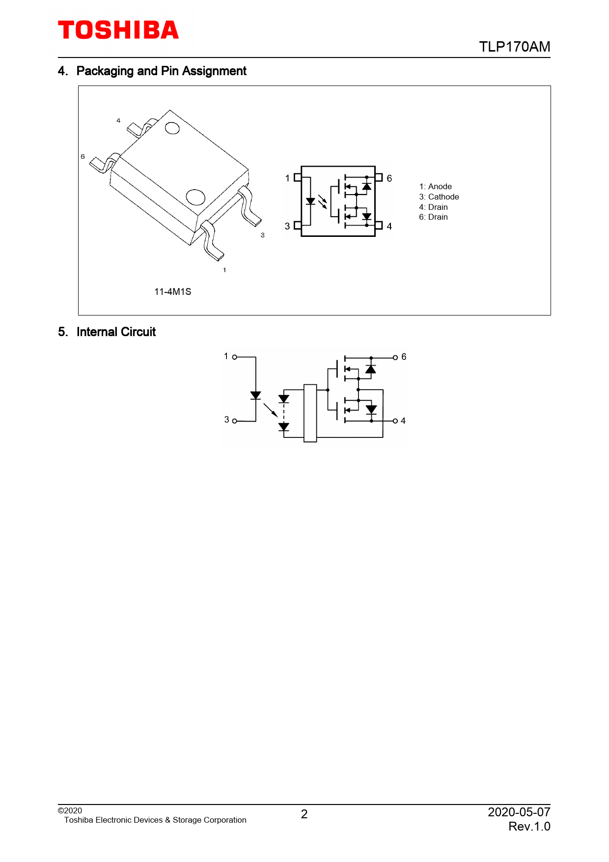 TLP170AM. 4. Packaging. and. Pin. Assignment. 1:. Anode. 3:. Cathode. 4:. Drain. 6:. Drain. 11-4M1S. 5. Internal. Circuit. ©2020. 2. 2020-05-07. Toshiba