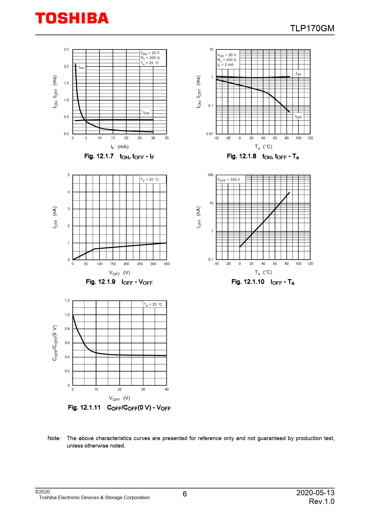 TLP170GM. Fig. 12.1.7. tON,. tOFF. -. IF. Fig. 12.1.8. tON,. tOFF. -. Ta. Fig. 12.1.9. IOFF. -. VOFF. Fig. 12.1.10. IOFF. -. Ta. Fig. 12.1.11. COFF/COFF(0. V). -. VOFF. Note:. The