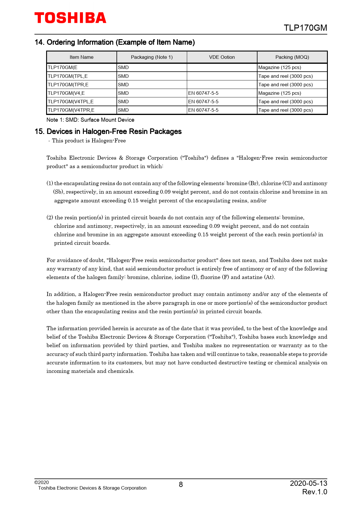 TLP170GM. 14. Ordering. Information. (Example. of. Item. Name). Item. Name. Packaging. (Note. 1). VDE. Ootion. Packing. (MOQ). TLP170GM(E. SMD. Magazine. (125
