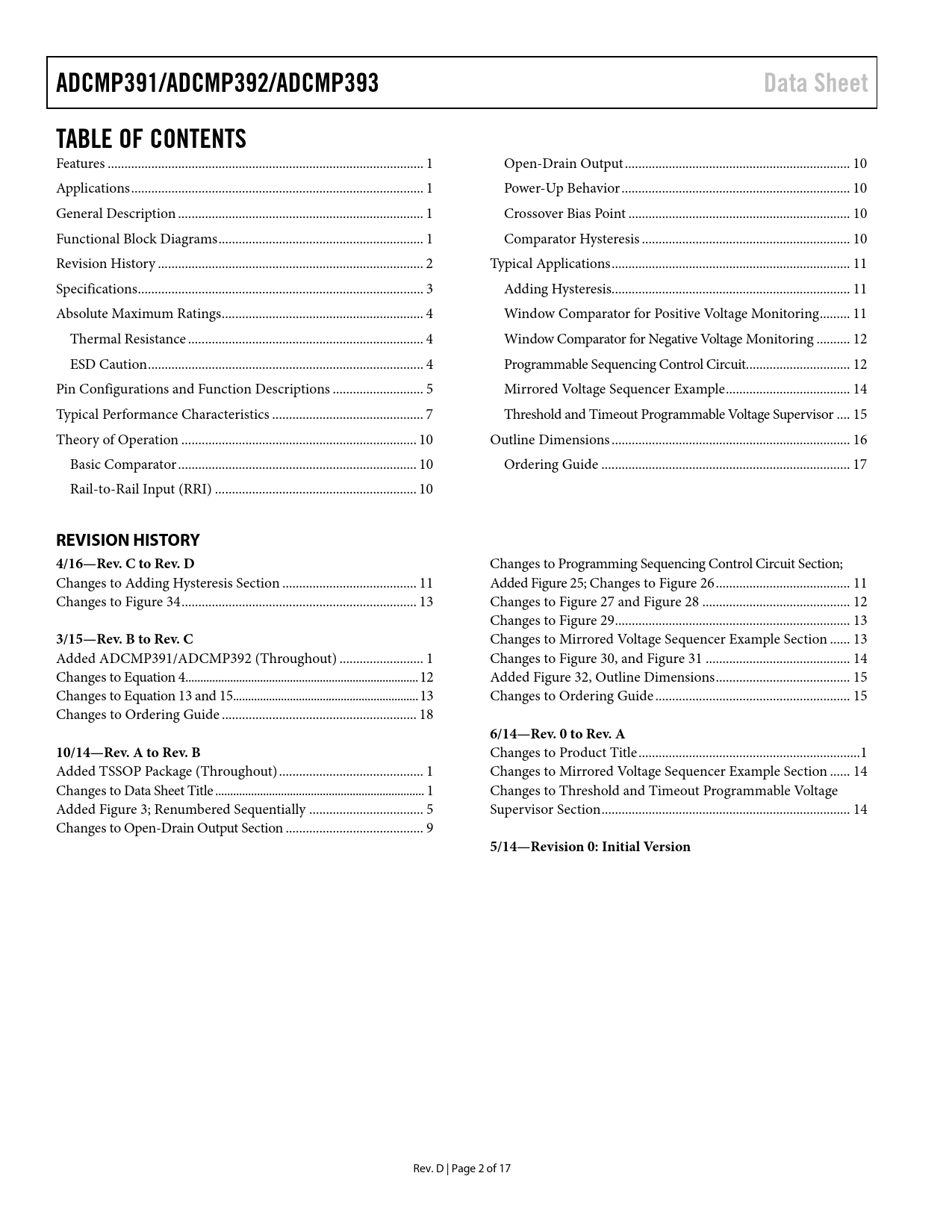 ADCMP391/ADCMP392/ADCMP393 Data Sheet TABLE OF CONTENTS REVISION HISTORY 4/16—Rev C to Rev D 3/15—Rev B to Rev C