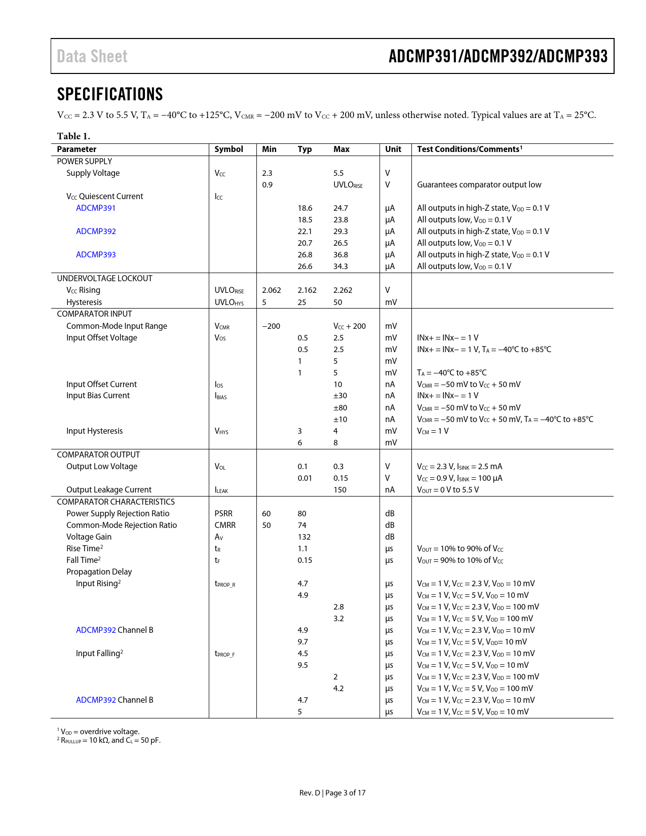 Data Sheet. ADCMP391/ADCMP392/ADCMP393. SPECIFICATIONS. Table 1. Parameter. Symbol. Min. Typ. Max. Unit. Test Conditions/Comments1