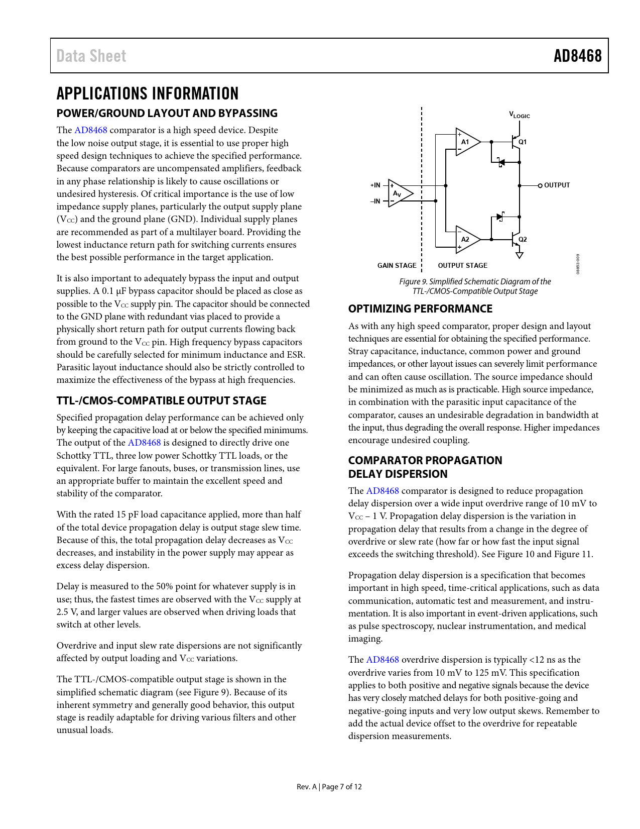 Data Sheet. AD8468. APPLICATIONS INFORMATION POWER/GROUND LAYOUT AND BYPASSING. VLOGIC. +IN. OUTPUT. –IN. GAIN STAGE. OUTPUT STAGE