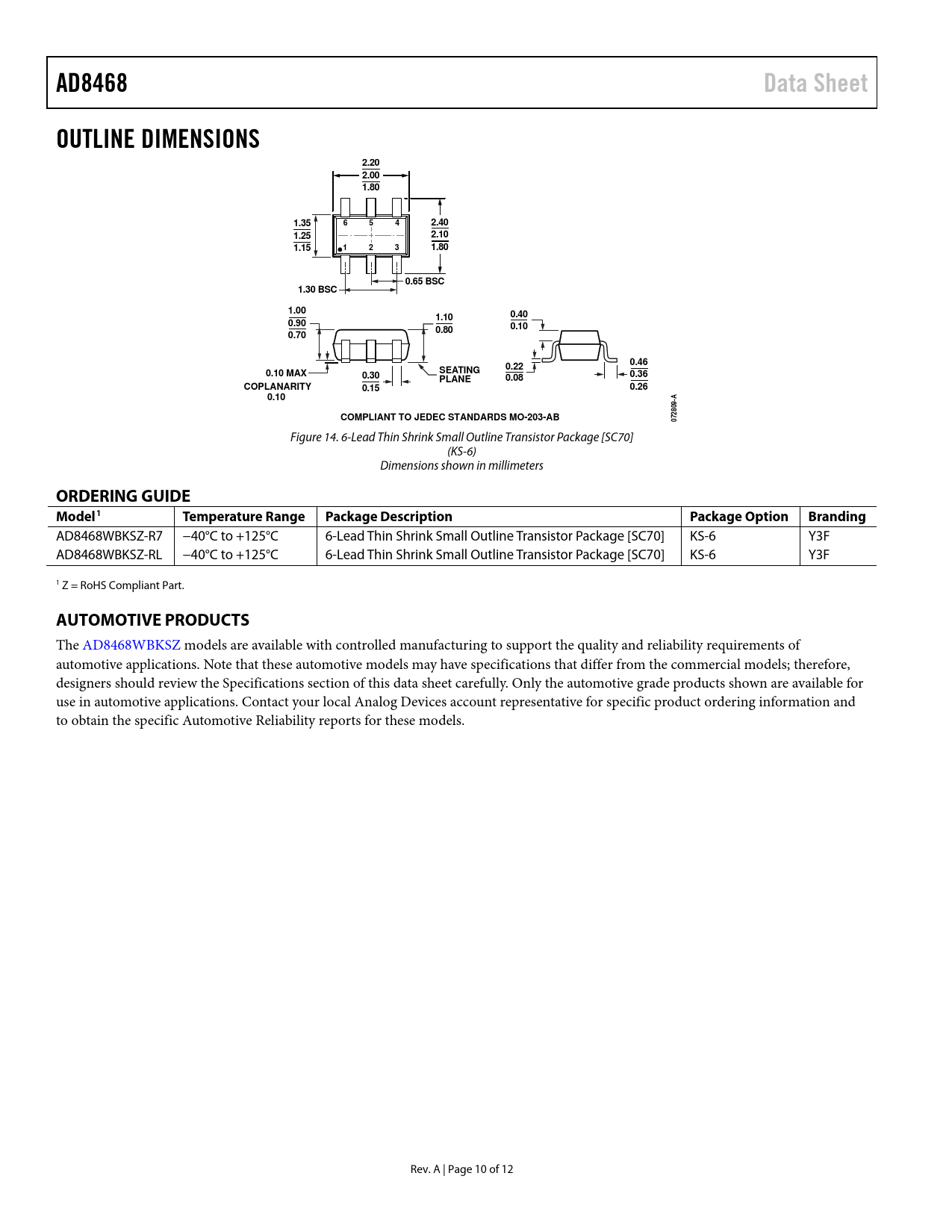 AD8468WBKSZ-R7 −40°C to +125°C 6-Lead Thin Shrink Small Outline Transistor Package [SC70] KS-6 Y3F AD8468WBKSZ-RL −40°C to +125°C 6-Lead Thin Shrink Small Outline Transistor Package [SC70] KS-6 Y3F 1 Z = RoHS Compliant Part.
