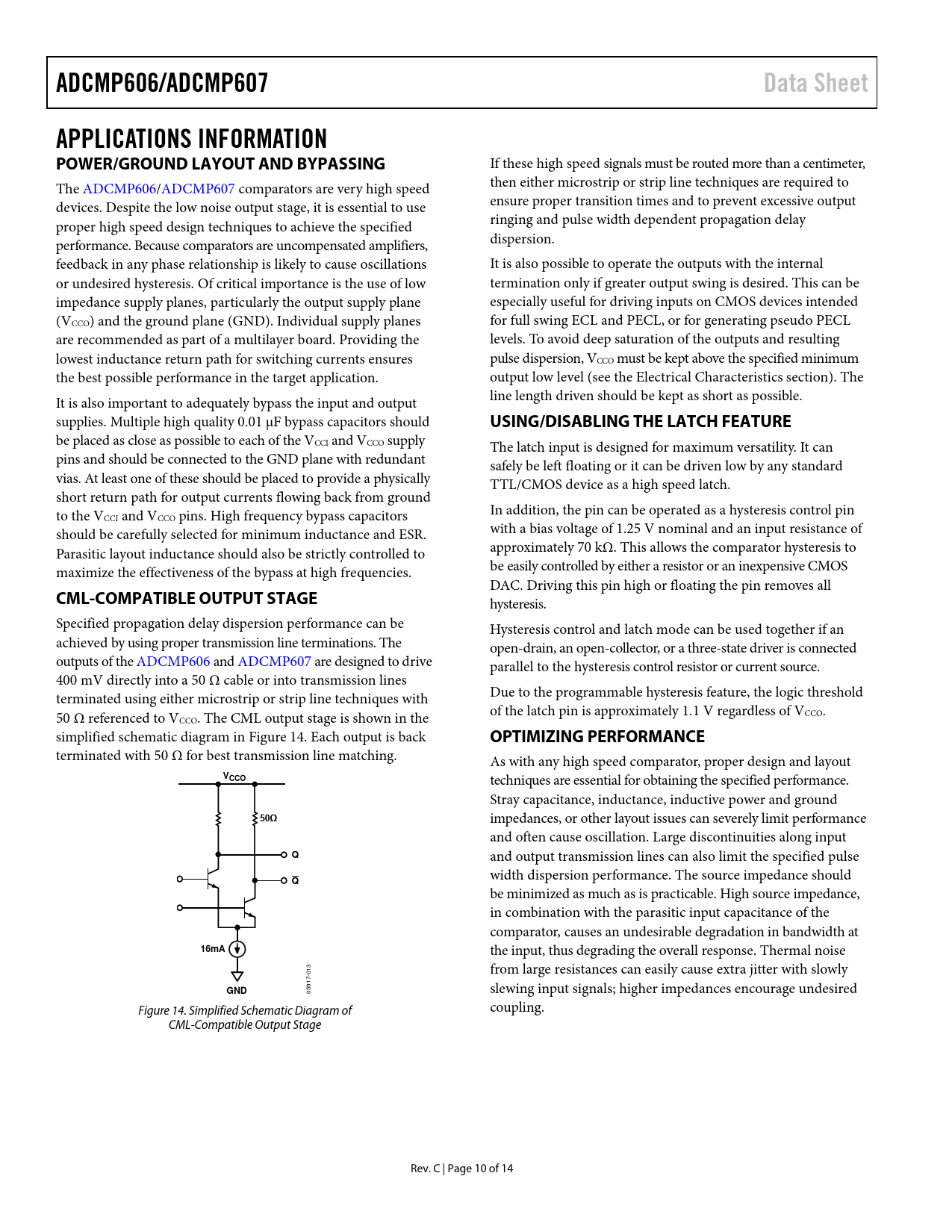 link to page 10 link to page 3 ADCMP606/ADCMP607Data SheetAPPLICATIONS INFORMATION POWER/GROUND LAYOUT AND BYPASSING If these high speed signals must be routed more than a centimeter, The ADCMP606/ADCMP607 comparators are very high speed then either microstrip or strip line techniques are required to devices. Despite the low noise output stage, it is essential to use ensure proper transition times and to prevent excessive output proper high speed design techniques to achieve the specified ringing and pulse width dependent propagation delay performance. Because comparators are uncompensated amplifiers, dispersion. feedback in any phase relationship is likely to cause oscil ations It is also possible to operate the outputs with the internal or undesired hysteresis. Of critical importance is the use of low termination only if greater output swing is desired. This can be impedance supply planes, particularly the output supply plane especially useful for driving inputs on CMOS devices intended (VCCO) and the ground plane (GND). Individual supply planes for ful swing ECL and PECL, or for generating pseudo PECL are recommended as part of a multilayer board. Providing the levels. To avoid deep saturation of the outputs and resulting lowest inductance return path for switching currents ensures pulse dispersion, VCCO must be kept above the specified minimum the best possible performance in the target application. output low level (see the Electrical Characteristics section). The It is also important to adequately bypass the input and output line length driven should be kept as short as possible. supplies. Multiple high quality 0.01 µF bypass capacitors should USING/DISABLING THE LATCH FEATURE be placed as close as possible to each of the VCCI and VCCO supply The latch input is designed for maximum versatility. It can pins and should be connected to the GND plane with redundant safely be left floating or it can be driven low by any standard vias. At least one of these should be placed to provide a physical y TTL/CMOS device as a high speed latch. short return path for output currents flowing back from ground to the V In addition, the pin can be operated as a hysteresis control pin CCI and VCCO pins. High frequency bypass capacitors should be carefully selected for minimum inductance and ESR. with a bias voltage of 1.25 V nominal and an input resistance of Parasitic layout inductance should also be strictly controlled to approximately 70 kΩ. This allows the comparator hysteresis to maximize the effectiveness of the bypass at high frequencies. be easily controlled by either a resistor or an inexpensive CMOS DAC. Driving this pin high or floating the pin removes al CML-COMPATIBLE OUTPUT STAGE hysteresis. Specified propagation delay dispersion performance can be Hysteresis control and latch mode can be used together if an achieved by using proper transmission line terminations. The open-drain, an open-collector, or a three-state driver is connected outputs of the ADCMP606 and ADCMP607 are designed to drive parallel to the hysteresis control resistor or current source. 400 mV directly into a 50 Ω cable or into transmission lines terminated using either microstrip or strip line techniques with Due to the programmable hysteresis feature, the logic threshold 50 Ω referenced to V of the latch pin is approximately 1.1 V regardless of VCCO. CCO. The CML output stage is shown in the simplified schematic diagram in Figure 14. Each output is back OPTIMIZING PERFORMANCE terminated with 50 Ω for best transmission line matching. As with any high speed comparator, proper design and layout VCCO techniques are essential for obtaining the specified performance. Stray capacitance, inductance, inductive power and ground 50Ω impedances, or other layout issues can severely limit performance and often cause oscillation. Large discontinuities along input Q and output transmission lines can also limit the specified pulse width dispersion performance. The source impedance should Q be minimized as much as is practicable. High source impedance, in combination with the parasitic input capacitance of the comparator, causes an undesirable degradation in bandwidth at 16mA the input, thus degrading the overall response. Thermal noise from large resistances can easily cause extra jitter with slowly 013 GND slewing input signals; higher impedances encourage undesired 05917- Figure 14. Simplified Schematic Diagram of coupling. CML-Compatible Output Stage Rev. C | Page 10 of 14 Document Outline FEATURES APPLICATIONS GENERAL DESCRIPTION FUNCTIONAL BLOCK DIAGRAM TABLE OF CONTENTS REVISION HISTORY SPECIFICATIONS ELECTRICAL CHARACTERISTICS TIMING INFORMATION ABSOLUTE MAXIMUM RATINGS THERMAL RESISTANCE ESD CAUTION PIN CONFIGURATIONS AND FUNCTION DESCRIPTIONS TYPICAL PERFORMANCE CHARACTERISTICS APPLICATIONS INFORMATION POWER/GROUND LAYOUT AND BYPASSING CML-COMPATIBLE OUTPUT STAGE USING/DISABLING THE LATCH FEATURE OPTIMIZING PERFORMANCE COMPARATOR PROPAGATION DELAY DISPERSION COMPARATOR HYSTERESIS CROSSOVER BIAS POINTS MINIMUM INPUT SLEW RATE REQUIREMENT TYPICAL APPLICATION CIRCUITS OUTLINE DIMENSIONS ORDERING GUIDE