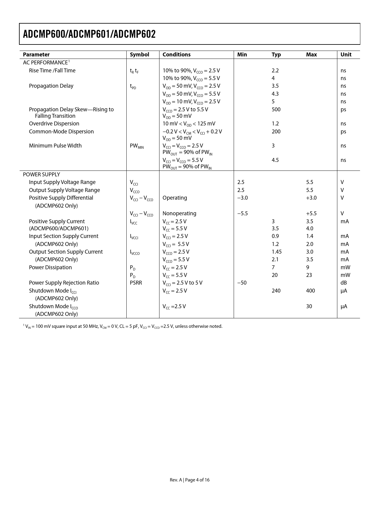 link to page 4 ADCMP600/ADCMP601/ADCMP602ParameterSymbolConditionsMinTypMaxUnit AC PERFORMANCE1 Rise Time /Fall Time t t 10% to 90%, V = 2.5 V 2.2 ns R F CCO 10% to 90%, V = 5.5 V 4 ns CCO Propagation Delay t V = 50 mV, V = 2.5 V 3.5 ns PD OD CCO V = 50 mV, V = 5.5 V 4.3 ns OD CCO V = 10 mV, V = 2.5 V 5 ns OD CCO Propagation Delay Skew—Rising to V = 2.5 V to 5.5 V 500 ps CCO Falling Transition V = 50 mV OD Overdrive Dispersion 10 mV < V < 125 mV 1.2 ns OD Common-Mode Dispersion −0.2 V < V < V + 0.2 V 200 ps CM CCI V = 50 mV OD Minimum Pulse Width PW V = V = 2.5 V 3 ns MIN CCI CCO PW = 90% of PW OUT IN V = V = 5.5 V 4.5 ns CCI CCO PW = 90% of PW OUT IN POWER SUPPLY Input Supply Voltage Range V 2.5 5.5 V CCI Output Supply Voltage Range V 2.5 5.5 V CCO Positive Supply Differential V − V Operating −3.0 +3.0 V CCI CCO (ADCMP602 Only) V − V Nonoperating −5.5 +5.5 V CCI CCO Positive Supply Current I V = 2.5 V 3 3.5 mA VCC CC (ADCMP600/ADCMP601) V = 5.5 V 3.5 4.0 CC Input Section Supply Current I V = 2.5 V 0.9 1.4 mA VCCI CCI (ADCMP602 Only) V = 5.5 V 1.2 2.0 mA CCI Output Section Supply Current I V = 2.5 V 1.45 3.0 mA VCCO CCO (ADCMP602 Only) V = 5.5 V 2.1 3.5 mA CCO Power Dissipation P V = 2.5 V 7 9 mW D CC P V = 5.5 V 20 23 mW D CC Power Supply Rejection Ratio PSRR V = 2.5 V to 5 V −50 dB CCI Shutdown Mode I V = 2.5 V 240 400 µA CCI CC (ADCMP602 Only) Shutdown Mode I V =2.5 V 30 µA CCO CC (ADCMP602 Only) 1 VIN = 100 mV square input at 50 MHz, VCM = 0 V, CL = 5 pF, VCCI = VCCO =2.5 V, unless otherwise noted. Rev. A | Page 4 of 16 Document Outline Features Applications Functional Block Diagram General Description Revision History Specifications Electrical Characteristics Timing Information Absolute Maximum Ratings Thermal Resistance ESD Caution Pin Configuration and Function Descriptions Typical Performance Characteristics Application Information Power/Ground Layout and Bypassing TTL-/CMOS-Compatible Output Stage Using/Disabling the Latch Feature Optimizing Performance Comparator Propagation Delay Dispersion Comparator Hysteresis Crossover Bias Point Minimum Input Slew Rate Requirement Typical Application Circuits Outline Dimensions Ordering Guide