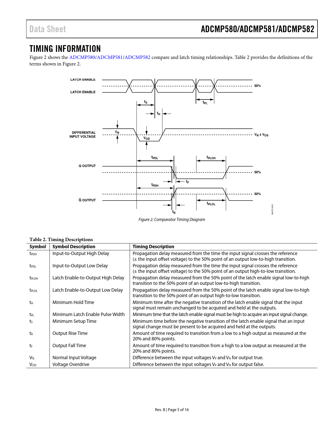 link to page 5 link to page 5 link to page 5 Data SheetADCMP580/ADCMP581/ADCMP582TIMING INFORMATION Figure 2 shows the ADCMP580/ADCMP581/ADCMP582 compare and latch timing relationships. Table 2 provides the definitions of the terms shown in Figure 2. LATCH ENABLE50%LATCH ENABLEtStPLtHDIFFERENTIALVNVN ± VOSINPUT VOLTAGEVODtPDLtPLOHQ OUTPUT50%tFtPDH50%Q OUTPUTtPLOL 002 tR 04672- Figure 2. Comparator Timing Diagram Table 2. Timing Descriptions Symbol Symbol DescriptionTiming Description tPDH Input-to-Output High Delay Propagation delay measured from the time the input signal crosses the reference (± the input offset voltage) to the 50% point of an output low-to-high transition. tPDL Input-to-Output Low Delay Propagation delay measured from the time the input signal crosses the reference (± the input offset voltage) to the 50% point of an output high-to-low transition. tPLOH Latch Enable-to-Output High Delay Propagation delay measured from the 50% point of the latch enable signal low-to-high transition to the 50% point of an output low-to-high transition. tPLOL Latch Enable-to-Output Low Delay Propagation delay measured from the 50% point of the latch enable signal low-to-high transition to the 50% point of an output high-to-low transition. tH Minimum Hold Time Minimum time after the negative transition of the latch enable signal that the input signal must remain unchanged to be acquired and held at the outputs. tPL Minimum Latch Enable Pulse Width Minimum time that the latch enable signal must be high to acquire an input signal change. tS Minimum Setup Time Minimum time before the negative transition of the latch enable signal that an input signal change must be present to be acquired and held at the outputs. tR Output Rise Time Amount of time required to transition from a low to a high output as measured at the 20% and 80% points. tF Output Fall Time Amount of time required to transition from a high to a low output as measured at the 20% and 80% points. VN Normal Input Voltage Difference between the input voltages VP and VN for output true. VOD Voltage Overdrive Difference between the input voltages VP and VN for output false. Rev. B | Page 5 of 16 Document Outline FEATURES APPLICATIONS FUNCTIONAL BLOCK DIAGRAM GENERAL DESCRIPTION TABLE OF CONTENTS REVISION HISTORY SPECIFICATIONS TIMING INFORMATION ABSOLUTE MAXIMUM RATINGS THERMAL CONSIDERATIONS ESD CAUTION PIN CONFIGURATIONS AND FUNCTION DESCRIPTIONS TYPICAL PERFORMANCE CHARACTERISTICS TYPICAL APPLICATION CIRCUITS APPLICATIONS INFORMATION POWER/GROUND LAYOUT AND BYPASSING ADCMP580/ADCMP581/ADCMP582 FAMILY OF OUTPUT STAGES USING/DISABLING THE LATCH FEATURE OPTIMIZING HIGH SPEED PERFORMANCE COMPARATOR PROPAGATION DELAY DISPERSION COMPARATOR HYSTERESIS MINIMUM INPUT SLEW RATE REQUIREMENT OUTLINE DIMENSIONS ORDERING GUIDE NOTES