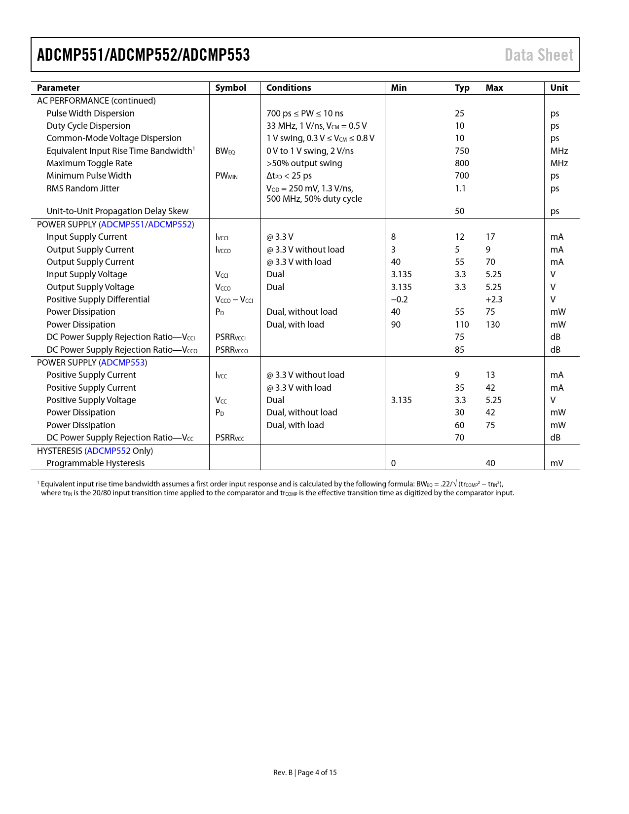 ADCMP551/ADCMP552/ADCMP553Data SheetParameter SymbolConditionsMinTypMaxUnit AC PERFORMANCE (continued) Pulse Width Dispersion 700 ps ≤ PW ≤ 10 ns 25 ps Duty Cycle Dispersion 33 MHz, 1 V/ns, VCM = 0.5 V 10 ps Common-Mode Voltage Dispersion 1 V swing, 0.3 V ≤ VCM ≤ 0.8 V 10 ps Equivalent Input Rise Time Bandwidth1 BWEQ 0 V to 1 V swing, 2 V/ns 750 MHz Maximum Toggle Rate >50% output swing 800 MHz Minimum Pulse Width PWMIN ΔtPD < 25 ps 700 ps RMS Random Jitter VOD = 250 mV, 1.3 V/ns, 1.1 ps 500 MHz, 50% duty cycle Unit-to-Unit Propagation Delay Skew 50 ps POWER SUPPLY (ADCMP551/ADCMP552) Input Supply Current IVCCI @ 3.3 V 8 12 17 mA Output Supply Current IVCCO @ 3.3 V without load 3 5 9 mA Output Supply Current @ 3.3 V with load 40 55 70 mA Input Supply Voltage VCCI Dual 3.135 3.3 5.25 V Output Supply Voltage VCCO Dual 3.135 3.3 5.25 V Positive Supply Differential VCCO − VCCI −0.2 +2.3 V Power Dissipation PD Dual, without load 40 55 75 mW Power Dissipation Dual, with load 90 110 130 mW DC Power Supply Rejection Ratio—VCCI PSRRVCCI 75 dB DC Power Supply Rejection Ratio—VCCO PSRRVCCO 85 dB POWER SUPPLY (ADCMP553) Positive Supply Current IVCC @ 3.3 V without load 9 13 mA Positive Supply Current @ 3.3 V with load 35 42 mA Positive Supply Voltage VCC Dual 3.135 3.3 5.25 V Power Dissipation PD Dual, without load 30 42 mW Power Dissipation Dual, with load 60 75 mW DC Power Supply Rejection Ratio—VCC PSRRVCC 70 dB HYSTERESIS (ADCMP552 Only) Programmable Hysteresis 0 40 mV 1 Equivalent input rise time bandwidth assumes a first order input response and is calculated by the following formula: BW 2 2 EQ = .22/ (trCOMP − trIN ), where trIN is the 20/80 input transition time applied to the comparator and trCOMP is the effective transition time as digitized by the comparator input. Rev. B | Page 4 of 15 Document Outline FEATURES APPLICATIONS FUNCTIONAL BLOCK DIAGRAM GENERAL DESCRIPTION TABLE OF CONTENTS REVISION HISTORY SPECIFICATIONS ABSOLUTE MAXIMUM RATINGS THERMAL CONSIDERATIONS ESD CAUTION PIN CONFIGURATIONS AND FUNCTION DESCRIPTIONS TYPICAL PERFORMANCE CHARACTERISTICS TIMING INFORMATION APPLICATIONS INFORMATION CLOCK TIMING RECOVERY OPTIMIZING HIGH SPEED PERFORMANCE COMPARATOR PROPAGATION DELAY DISPERSION COMPARATOR HYSTERESIS MINIMUM INPUT SLEW RATE REQUIREMENT TYPICAL APPLICATION CIRCUITS OUTLINE DIMENSIONS ORDERING GUIDE