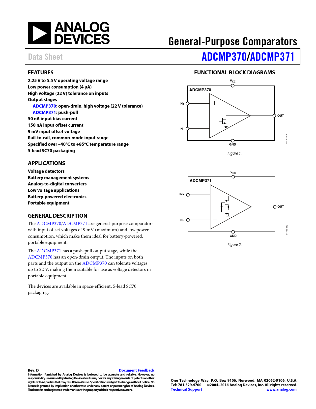 General-Purpose Comparators. Data Sheet. ADCMP370/. ADCMP371. FEATURES. FUNCTIONAL BLOCK DIAGRAMS
