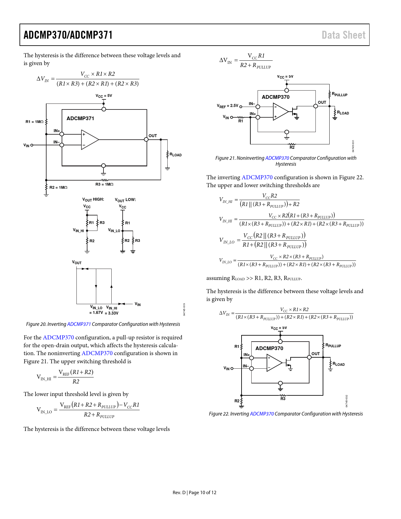 For the ADCMP370 configuration, a pull-up resistor is required for the open-drain output, which affects the hysteresis calcula-