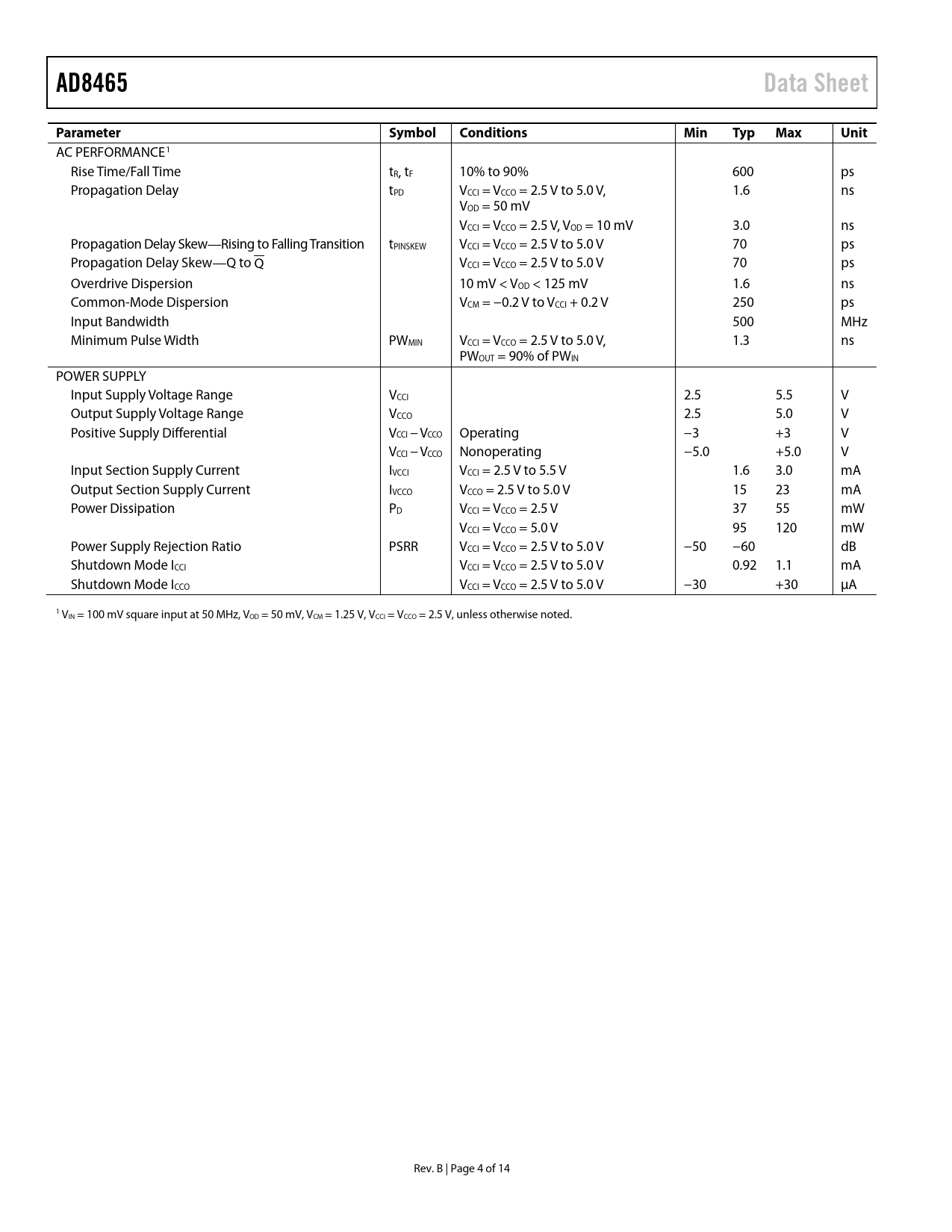 | Pages / Page | 14 / 4 — AD8465. Data Sheet. Parameter. Symbol. Conditions. Min. Typ. Max. Unit |