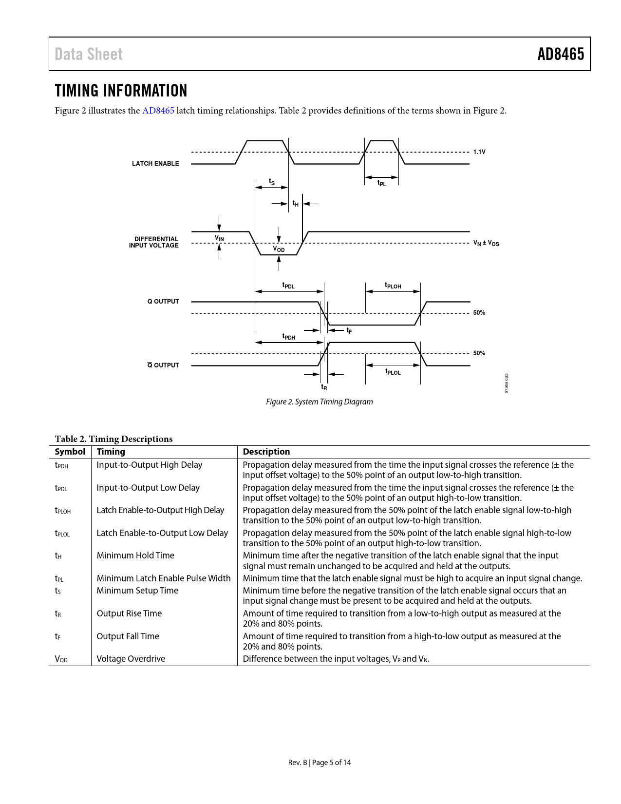 Data Sheet AD8465 TIMING INFORMATION 1.1V LATCH ENABLE tPL DIFFERENTIAL VIN VN ± VOS INPUT VOLTAGE VOD tPDL tPLOH Q OUTPUT 50% tPDH
