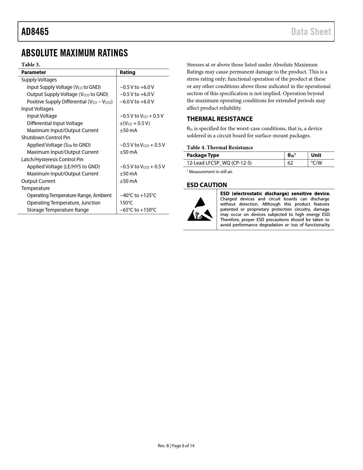 AD8465 Data Sheet ABSOLUTE MAXIMUM RATINGS Table 3 Parameter Rating THERMAL RESISTANCE Table 4 Thermal Resistance
