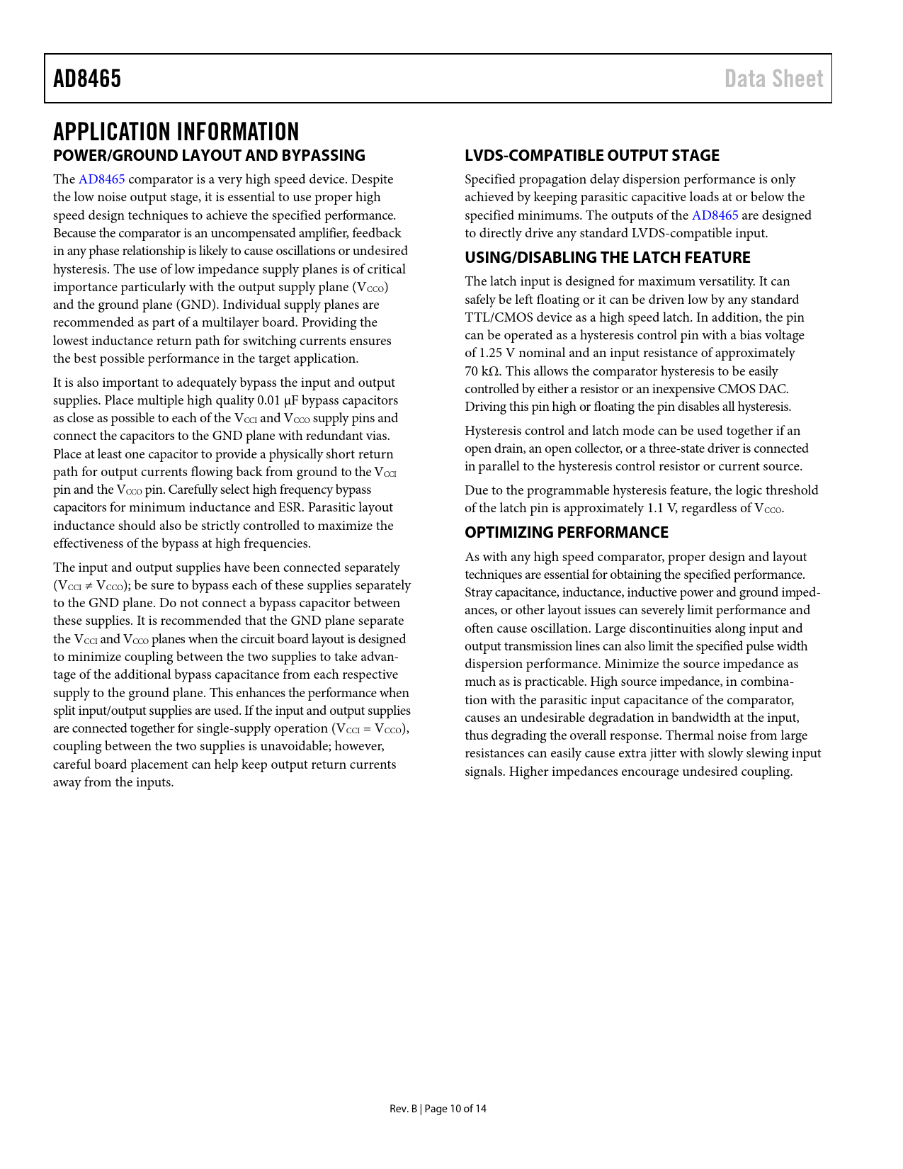 AD8465. Data Sheet. APPLICATION INFORMATION POWER/GROUND LAYOUT AND BYPASSING. LVDS-COMPATIBLE OUTPUT STAGE