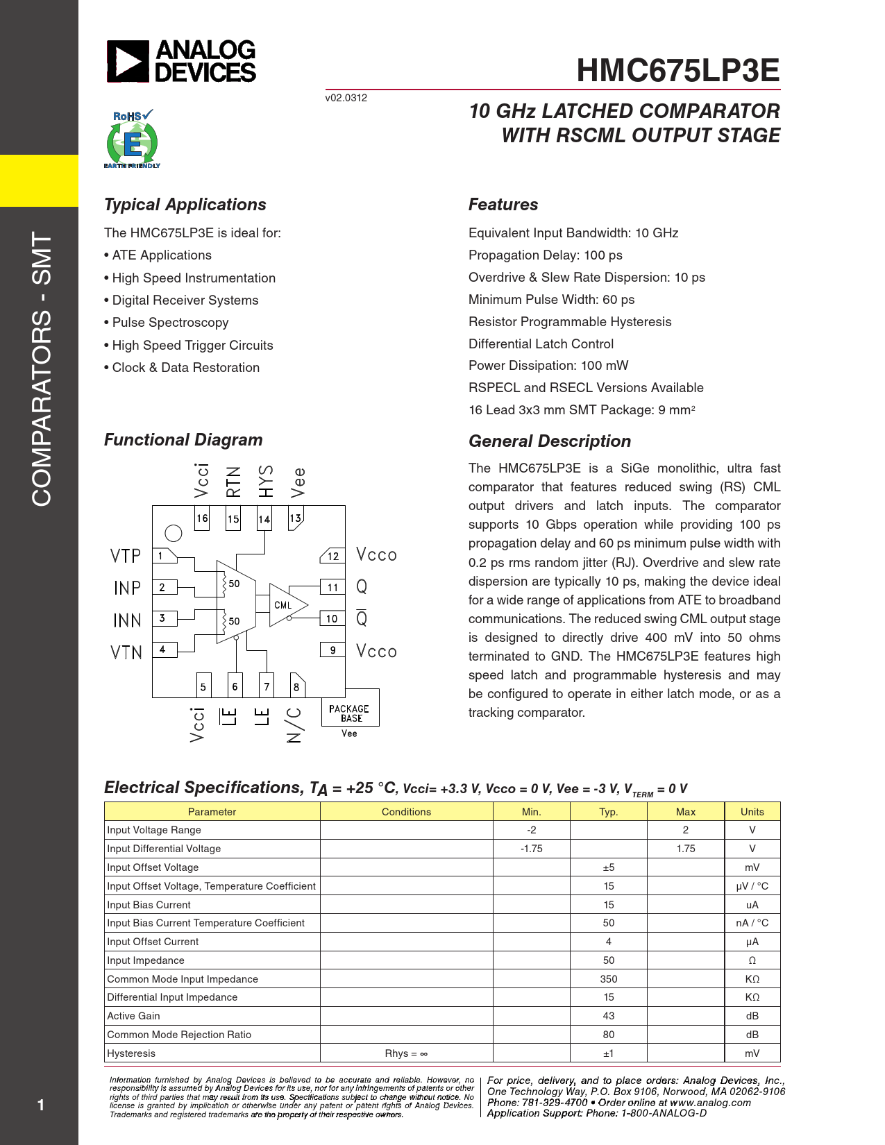HMC675LP3E v02.0312 10 GHz LATCHED COMPARATORWITH RSCML OUTPUT STAGETypical ApplicationsFeatures T The HMC675LP3E is ideal for: Equivalent Input Bandwidth: 10 GHz M • ATE Applications Propagation Delay: 100 ps • High Speed Instrumentation Overdrive & Slew Rate Dispersion: 10 ps • Digital Receiver Systems Minimum Pulse Width: 60 ps S - S R • Pulse Spectroscopy Resistor Programmable Hysteresis O • High Speed Trigger Circuits Differential Latch Control • Clock & Data Restoration Power Dissipation: 100 mW AT RSPECL and RSECL Versions Available R A 16 Lead 3x3 mm SMT Package: 9 mm2 P Functional DiagramGeneral Description OM The HMC675LP3E is a SiGe monolithic, ultra fast C comparator that features reduced swing (RS) CML output drivers and latch inputs. The comparator supports 10 Gbps operation while providing 100 ps propagation delay and 60 ps minimum pulse width with 0.2 ps rms random jitter (RJ). Overdrive and slew rate dispersion are typical y 10 ps, making the device ideal for a wide range of applications from ATE to broadband communications. The reduced swing CML output stage is designed to directly drive 400 mV into 50 ohms terminated to GND. The HMC675LP3E features high speed latch and programmable hysteresis and may be configured to operate in either latch mode, or as a tracking comparator. Electrical Specifications, TA = +25 °C, Vcci= +3.3 V, Vcco = 0 V, Vee = -3 V, V = 0 VTERM Parameter Conditions Min. Typ. Max Units Input Voltage Range -2 2 V Input Differential Voltage -1.75 1.75 V Input Offset Voltage ±5 mV Input Offset Voltage, Temperature Coefficient 15 µV / °C Input Bias Current 15 uA Input Bias Current Temperature Coefficient 50 nA / °C Input Offset Current 4 µA Input Impedance 50 Ω Common Mode Input Impedance 350 KΩ Differential Input Impedance 15 KΩ Active Gain 43 dB Common Mode Rejection Ratio 80 dB Hysteresis Rhys = ∞ ±1 mV I F nf o or r p mati r o in cfe ur , d nish e e l d iv b e y r A y a nalo n g d t Devi o p ces i la s c bele o ieve rd d t e o rbs e : H acc iutrtatite e M and ic reli rao bl w e. a H v o e C wever o , nrp o For price, delivery, and to place orders: Analog Devices, Inc., responsibility is assumed by Analog Devices for its use, nor for any infringements of patents or other oration, 2 Elizabeth Drive, Chelmsford, MA 01824 One Technology Way, P.O. Box 9106, Norwood, MA 02062-9106 Phone: 978-250-3343 Fax: 978-250-3373 O rights of third parties that may result from its use. Specifications subject to change without notice. No rd Phoe n r O e: 7 n- 81-li 3 n 2 e a 9-4 t w 70 ww 0 • O . rdh e itt r o it nle i . n co e a m 1 license is granted by implication or otherwise under any patent or patent rights of Analog Devices. t www.analog.com Application Support: Phon Trademarks and registered trademarks are the property of their respective owners. e: 978-250-334 A 3 p o plic ra a tio pp n S s u @ p h por ittti : Pte ho.c n om e: 1-800-ANALOG-D