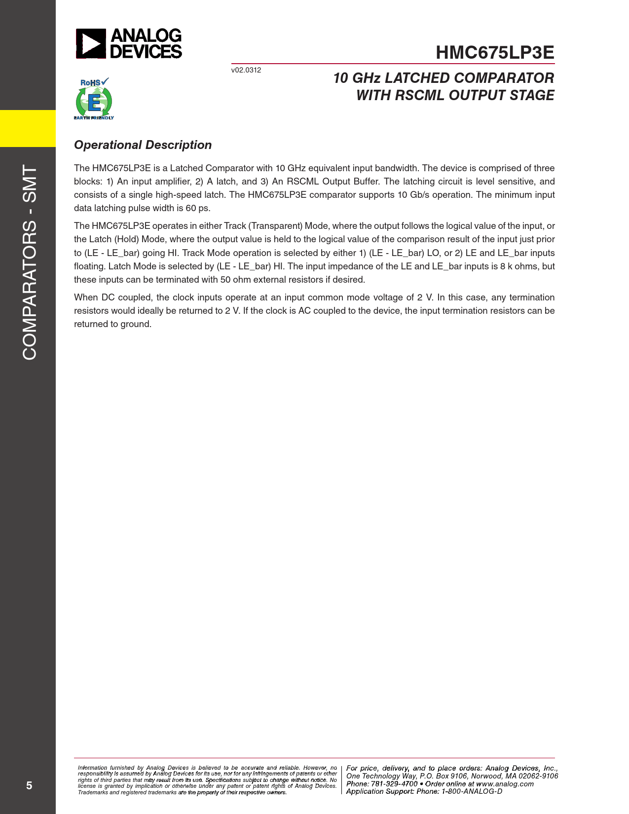 HMC675LP3E. 10 GHz LATCHED COMPARATOR. WITH RSCML OUTPUT STAGE. Operational Description