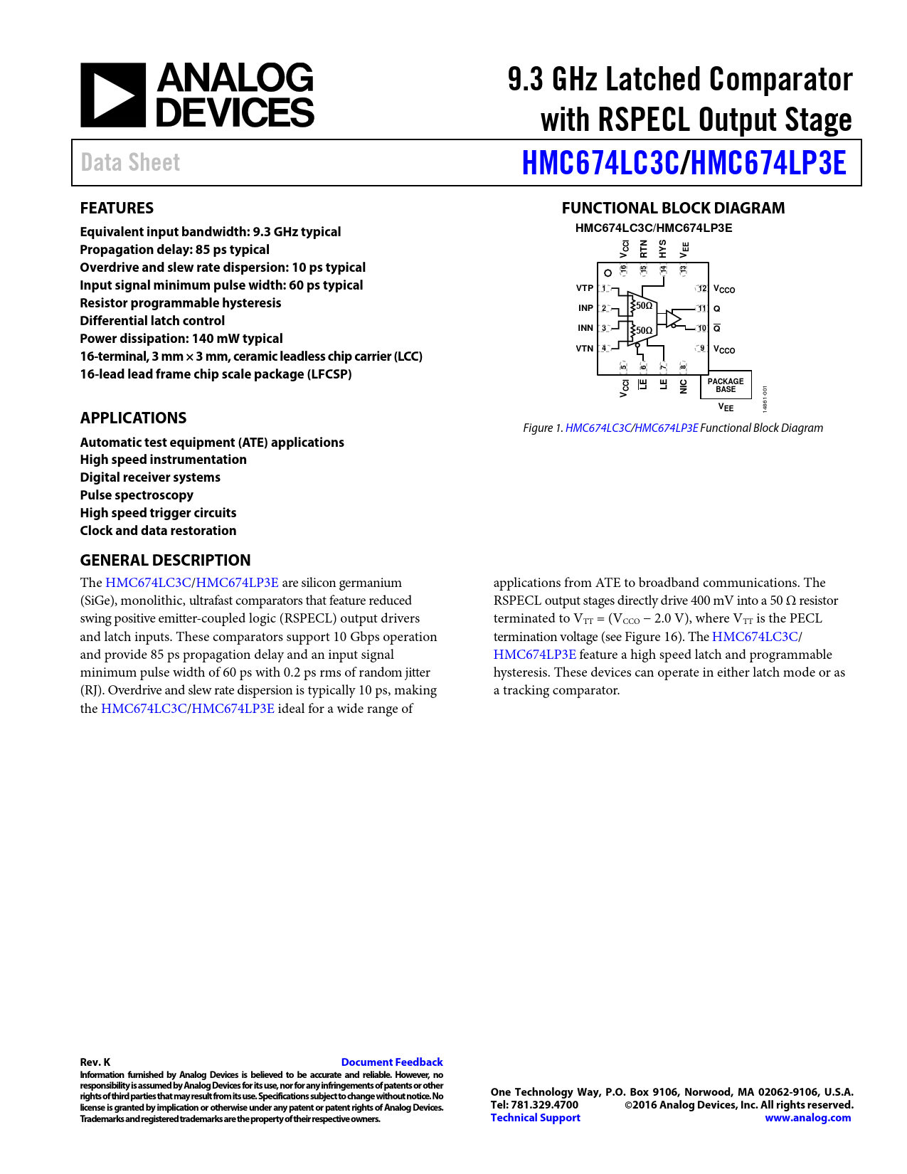 9.3 GHz Latched Comparator. with RSPECL Output Stage. Data Sheet. HMC674LC3C. /HMC674LP3E. FEATURES. FUNCTIONAL BLOCK DIAGRAM