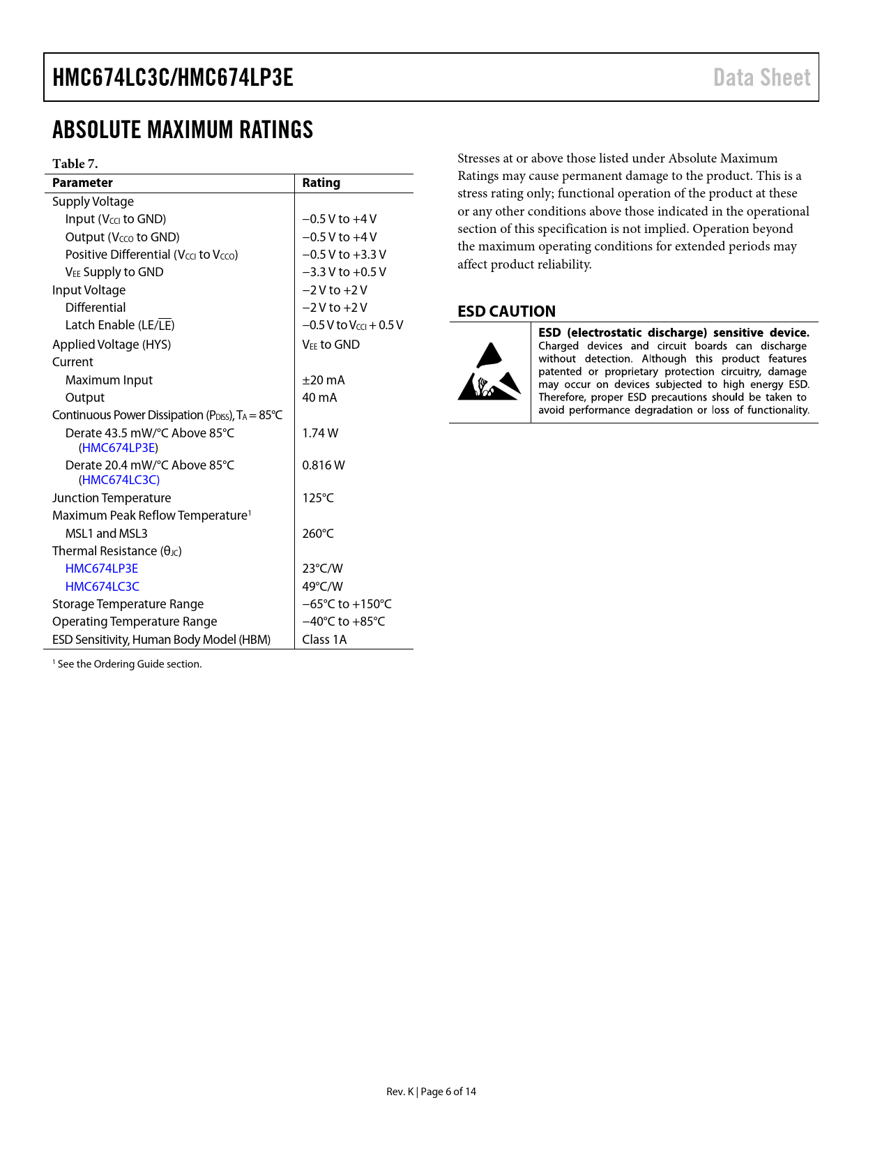 HMC674LC3C/HMC674LP3E. Data Sheet. ABSOLUTE MAXIMUM RATINGS Table 7. Parameter. Rating. ESD CAUTION