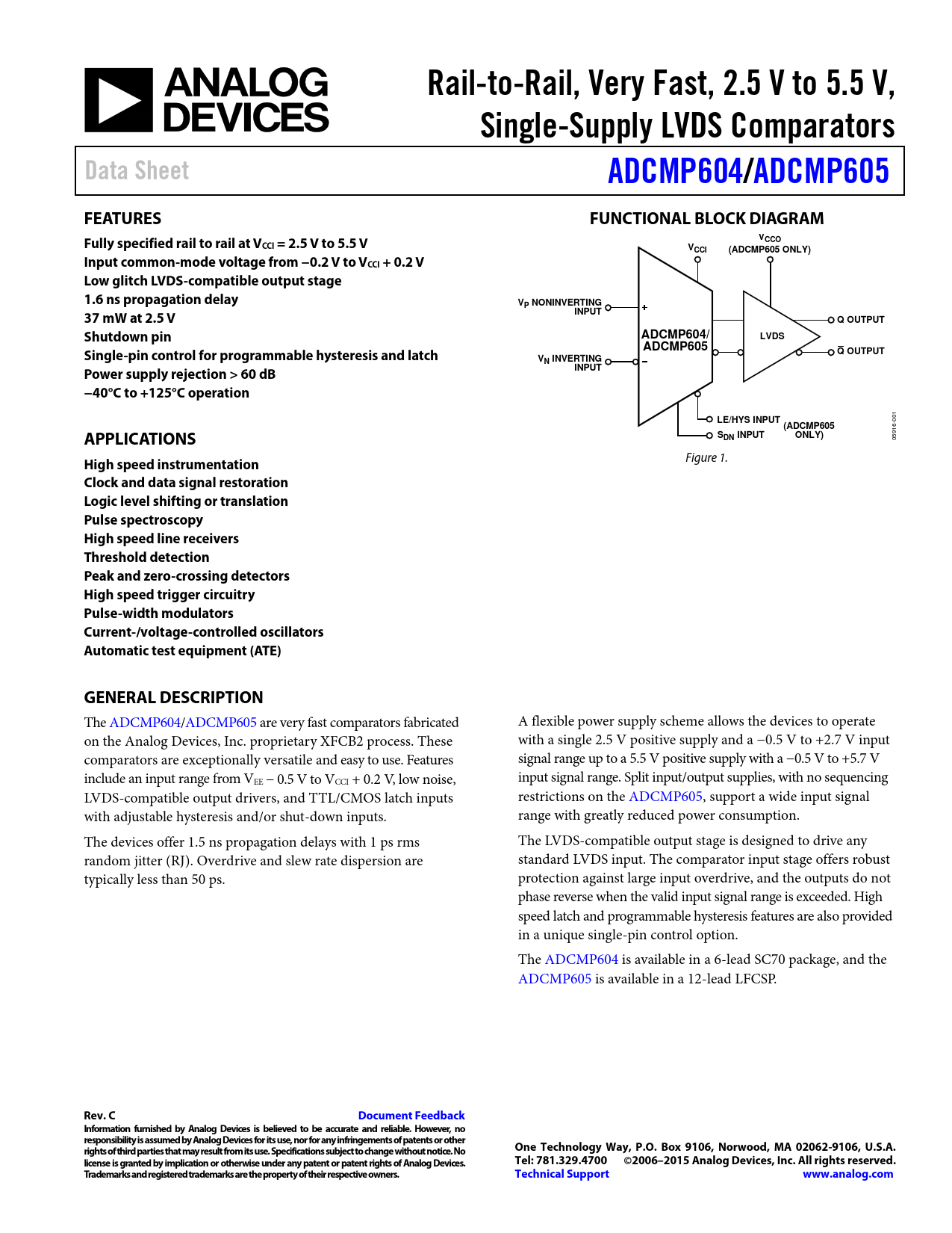 Rail-to-Rail, Very Fast, 2.5 V to 5.5 V,. Single-Supply LVDS Comparators. Data Sheet. ADCMP604/. ADCMP605. FEATURES