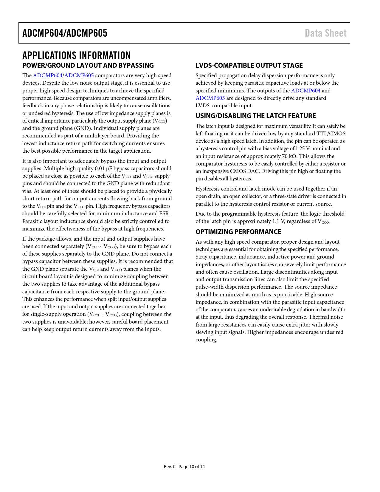 The ADCMP604/ADCMP605 comparators are very high speed Specified propagation delay dispersion performance is only devices. Despite the low noise output stage, it is essential to use achieved by keeping parasitic capacitive loads at or below the proper high speed design techniques to achieve the specified specified minimums. The outputs of the ADCMP604 and performance. Because comparators are uncompensated amplifiers, ADCMP605 are designed to directly drive any standard feedback in any phase relationship is likely to cause oscil ations LVDS-compatible input. or undesired hysteresis. The use of low impedance supply planes is