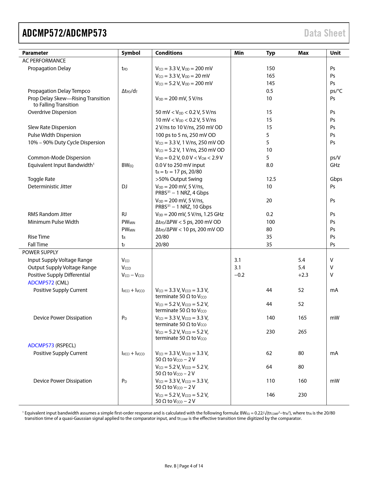| Pages / Page | 14 / 4 — ADCMP572/ADCMP573. Data Sheet. Parameter Symbol. Conditions. Min. Typ. … |