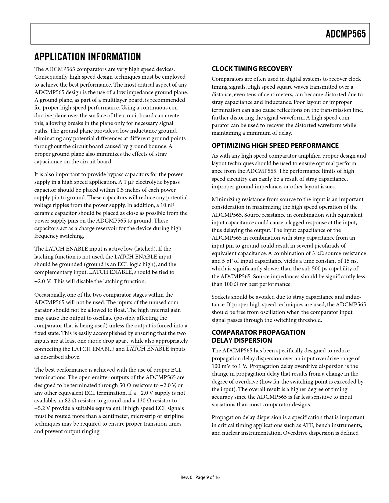 ADCMP565 APPLICATION INFORMATION The ADCMP565 comparators are very high speed devices. CLOCK TIMING RECOVERY Consequently, high speed design techniques must be employed Comparators are often used in digital systems to recover clock to achieve the best performance. The most critical aspect of any timing signals. High speed square waves transmitted over a ADCMP565 design is the use of a low impedance ground plane. distance, even tens of centimeters, can become distorted due to A ground plane, as part of a multilayer board, is recommended stray capacitance and inductance. Poor layout or improper for proper high speed performance. Using a continuous con- termination can also cause reflections on the transmission line, ductive plane over the surface of the circuit board can create further distorting the signal waveform. A high speed com- this, allowing breaks in the plane only for necessary signal parator can be used to recover the distorted waveform while paths. The ground plane provides a low inductance ground, maintaining a minimum of delay. eliminating any potential differences at different ground points throughout the circuit board caused by ground bounce. A OPTIMIZING HIGH SPEED PERFORMANCE proper ground plane also minimizes the effects of stray As with any high speed comparator amplifier, proper design and capacitance on the circuit board. layout techniques should be used to ensure optimal perform- ance from the ADCMP565. The performance limits of high It is also important to provide bypass capacitors for the power speed circuitry can easily be a result of stray capacitance, supply in a high speed application. A 1 µF electrolytic bypass improper ground impedance, or other layout issues. capacitor should be placed within 0.5 inches of each power supply pin to ground. These capacitors will reduce any potential Minimizing resistance from source to the input is an important voltage ripples from the power supply. In addition, a 10 nF consideration in maximizing the high speed operation of the ceramic capacitor should be placed as close as possible from the ADCMP565. Source resistance in combination with equivalent power supply pins on the ADCMP565 to ground. These input capacitance could cause a lagged response at the input, capacitors act as a charge reservoir for the device during high thus delaying the output. The input capacitance of the frequency switching. ADCMP565 in combination with stray capacitance from an input pin to ground could result in several picofarads of The LATCH ENABLE input is active low (latched). If the equivalent capacitance. A combination of 3 kΩ source resistance latching function is not used, the LATCH ENABLE input and 5 pF of input capacitance yields a time constant of 15 ns, should be grounded (ground is an ECL logic high), and the which is significantly slower than the sub 500 ps capability of complementary input, LATCH ENABLE, should be tied to the ADCMP565. Source impedances should be significantly less −2.0 V. This will disable the latching function. than 100 Ω for best performance. Occasionally, one of the two comparator stages within the Sockets should be avoided due to stray capacitance and induc- ADCMP565 will not be used. The inputs of the unused com- tance. If proper high speed techniques are used, the ADCMP565 parator should not be allowed to float. The high internal gain should be free from oscillation when the comparator input may cause the output to oscillate (possibly affecting the signal passes through the switching threshold. comparator that is being used) unless the output is forced into a fixed state. This is easily accomplished by ensuring that the two COMPARATOR PROPAGATION inputs are at least one diode drop apart, while also appropriately DELAY DISPERSION connecting the LATCH ENABLE and LATCH ENABLE inputs The ADCMP565 has been specifically designed to reduce as described above. propagation delay dispersion over an input overdrive range of 100 mV to 1 V. Propagation delay overdrive dispersion is the The best performance is achieved with the use of proper ECL change in propagation delay that results from a change in the terminations. The open emitter outputs of the ADCMP565 are degree of overdrive (how far the switching point is exceeded by designed to be terminated through 50 Ω resistors to −2.0 V, or the input). The overall result is a higher degree of timing any other equivalent ECL termination. If a −2.0 V supply is not accuracy since the ADCMP565 is far less sensitive to input available, an 82 Ω resistor to ground and a 130 Ω resistor to variations than most comparator designs. −5.2 V provide a suitable equivalent. If high speed ECL signals must be routed more than a centimeter, microstrip or stripline Propagation delay dispersion is a specification that is important techniques may be required to ensure proper transition times in critical timing applications such as ATE, bench instruments, and prevent output ringing. and nuclear instrumentation. Overdrive dispersion is defined Rev. 0 | Page 9 of 16 Document Outline SPECIFICATIONS ABSOLUTE MAXIMUM RATINGS THERMAL CONSIDERATIONS ESD CAUTION PIN CONFIGURATION AND FUNCTION DESCRIPTIONS TIMING INFORMATION APPLICATION INFORMATION CLOCK TIMING RECOVERY OPTIMIZING HIGH SPEED PERFORMANCE COMPARATOR PROPAGATION DELAY DISPERSION COMPARATOR HYSTERESIS MINIMUM INPUT SLEW RATE REQUIREMENT TYPICAL APPLICATION CIRCUITS TYPICAL PERFORMANCE CHARACTERISTICS OUTLINE DIMENSIONS ORDERING GUIDE