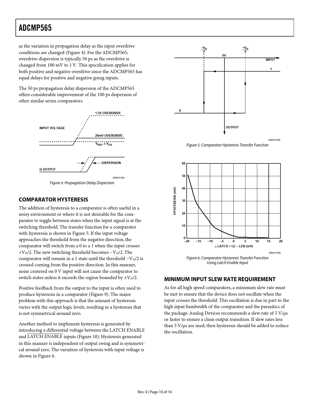 link to page 10 link to page 10 link to page 11 link to page 11 link to page 10 ADCMP565 as the variation in propagation delay as the input overdrive –VH+VH conditions are changed (Figure 4). For the ADCMP565, 220V overdrive dispersion is typically 50 ps as the overdrive is INPUT changed from 100 mV to 1 V. This specification applies for 1 both positive and negative overdrive since the ADCMP565 has equal delays for positive and negative going inputs. The 50 ps propagation delay dispersion of the ADCMP565 offers considerable improvement of the 100 ps dispersion of other similar series comparators. 01.5V OVERDRIVEINPUT VOLTAGEOUTPUT20mV OVERDRIVE 02820-0-005 VREF ± VOS Figure 5. Comparator Hysteresis Transfer Function DISPERSION60Q OUTPUT50 02820-0-004 Figure 4. Propagation Delay Dispersion V)40mCOMPARATOR HYSTERESISESIS (30 The addition of hysteresis to a comparator is often useful in a YSTER noisy environment or where it is not desirable for the com- H20 parator to toggle between states when the input signal is at the switching threshold. The transfer function for a comparator 10 with hysteresis is shown in Figure 5. If the input voltage approaches the threshold from the negative direction, the 0–20 –15 –10–505101520 comparator will switch from a 0 to a 1 when the input crosses ∆ LATCH = LE – LEB (mV) +VH/2. The new switching threshold becomes −VH/2. The 02820-0-006 comparator will remain in a 1 state until the threshold −VH/2 is Figure 6. Comparator Hysteresis Transfer Function crossed coming from the positive direction. In this manner, Using Latch Enable Input noise centered on 0 V input will not cause the comparator to switch states unless it exceeds the region bounded by ±VH/2. MINIMUM INPUT SLEW RATE REQUIREMENT Positive feedback from the output to the input is often used to As for all high speed comparators, a minimum slew rate must produce hysteresis in a comparator (Figure 9). The major be met to ensure that the device does not oscillate when the problem with this approach is that the amount of hysteresis input crosses the threshold. This oscillation is due in part to the varies with the output logic levels, resulting in a hysteresis that high input bandwidth of the comparator and the parasitics of is not symmetrical around zero. the package. Analog Devices recommends a slew rate of 5 V/µs or faster to ensure a clean output transition. If slew rates less Another method to implement hysteresis is generated by than 5 V/µs are used, then hysteresis should be added to reduce introducing a differential voltage between the LATCH ENABLE the oscillation. and LATCH ENABLE inputs (Figure 10). Hysteresis generated in this manner is independent of output swing and is symmetri- cal around zero. The variation of hysteresis with input voltage is shown in Figure 6. Rev. 0 | Page 10 of 16 Document Outline SPECIFICATIONS ABSOLUTE MAXIMUM RATINGS THERMAL CONSIDERATIONS ESD CAUTION PIN CONFIGURATION AND FUNCTION DESCRIPTIONS TIMING INFORMATION APPLICATION INFORMATION CLOCK TIMING RECOVERY OPTIMIZING HIGH SPEED PERFORMANCE COMPARATOR PROPAGATION DELAY DISPERSION COMPARATOR HYSTERESIS MINIMUM INPUT SLEW RATE REQUIREMENT TYPICAL APPLICATION CIRCUITS TYPICAL PERFORMANCE CHARACTERISTICS OUTLINE DIMENSIONS ORDERING GUIDE