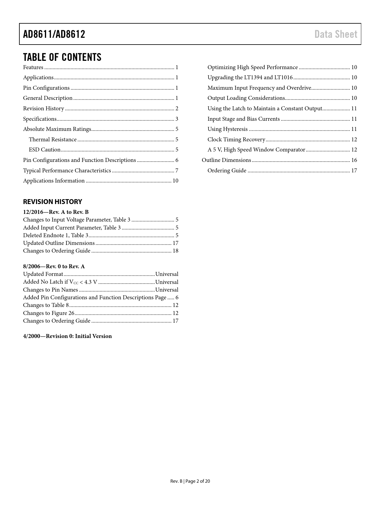 Pages / Page20 / 2 — AD8611/AD8612. Data Sheet. TABLE OF CONTENTS. REVISION HISTORY …