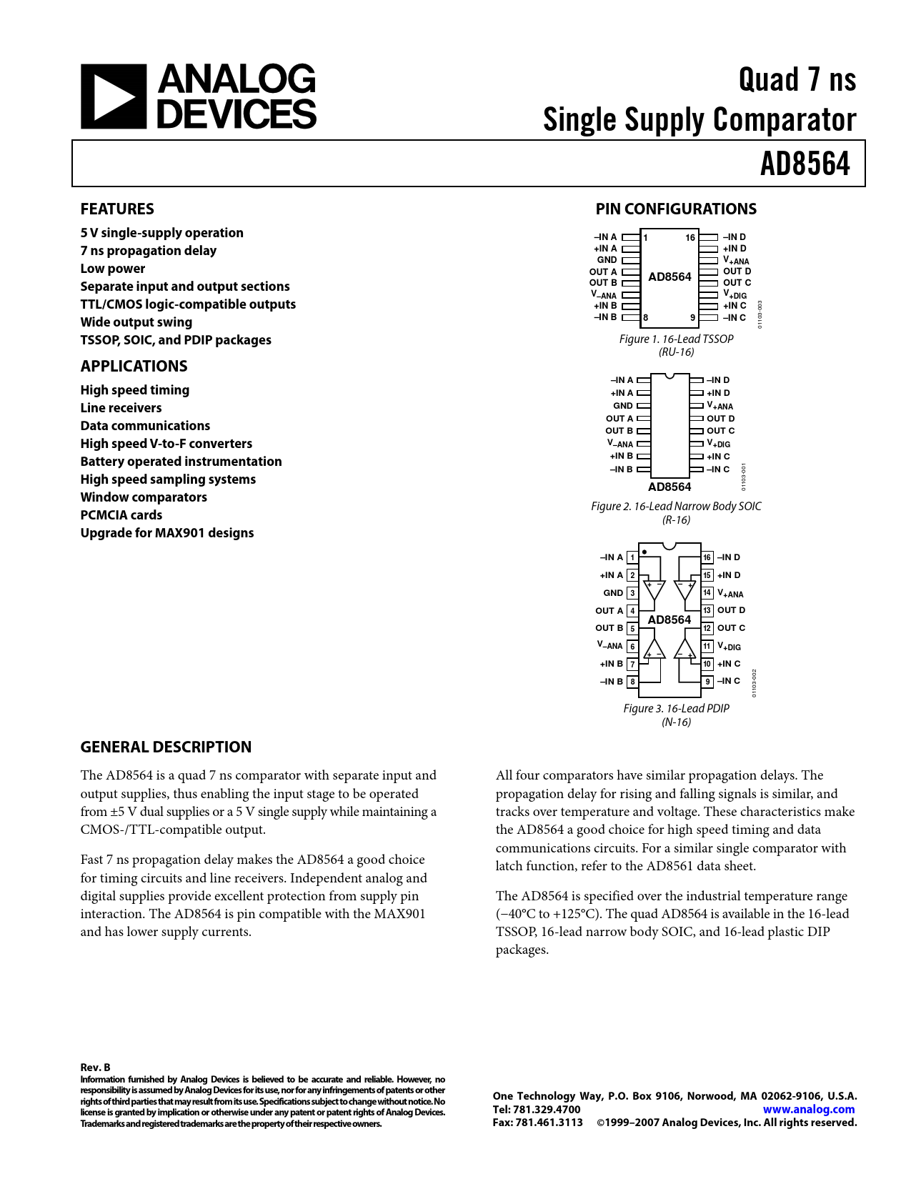 Quad 7 ns Single Supply Comparator AD8564 FEATURES PIN CONFIGURATIONS 5 V single-supply operation –IN A 1 16 –IN D 7 ns propagation delay +IN A +IN D GND V+ANA Low power OUT A OUT D AD8564 Separate input and output sections OUT B OUT C V V –ANA +DIG TTL/CMOS logic-compatible outputs +IN B +IN C
