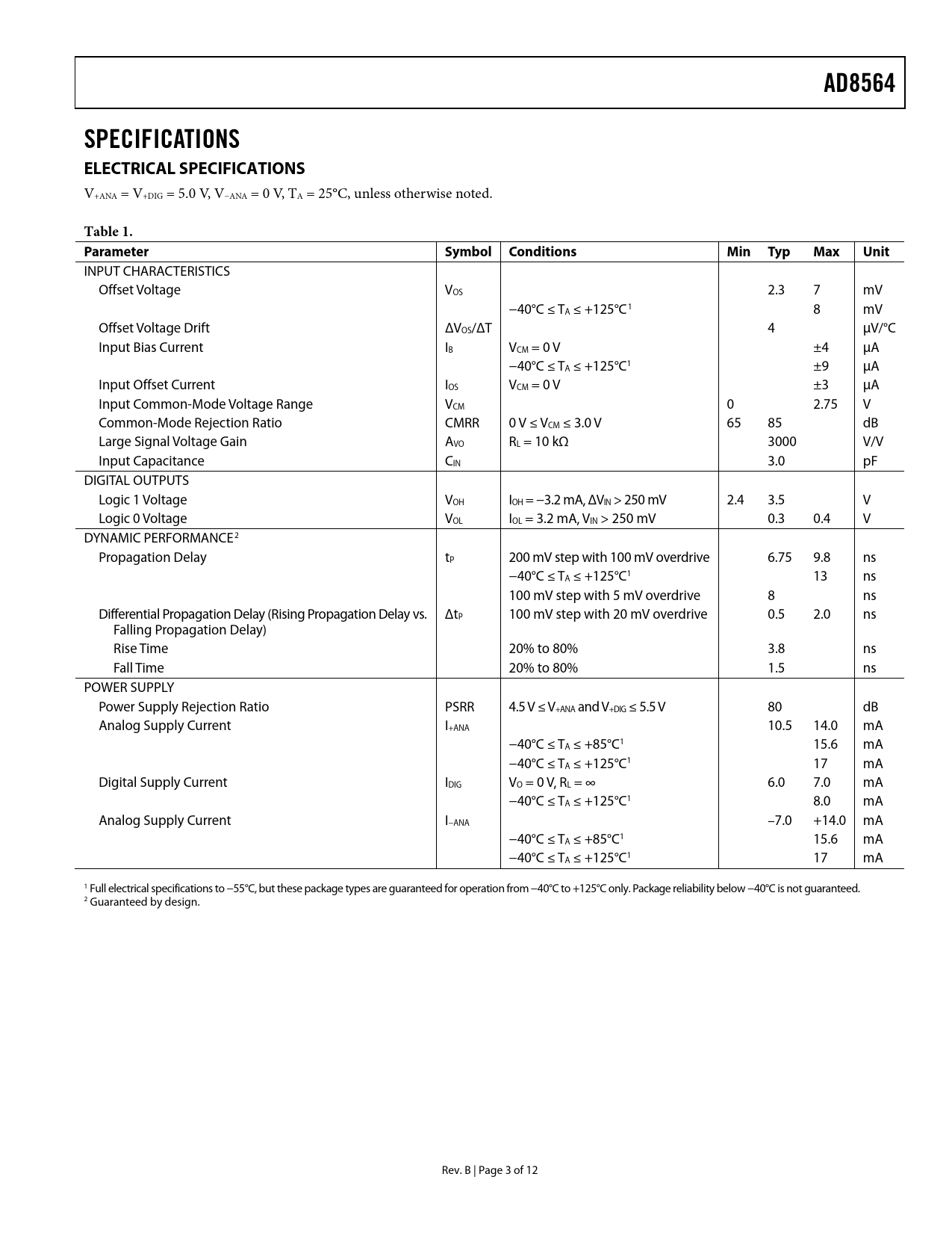 Pages / Page12 / 3 — AD8564. SPECIFICATIONS ELECTRICAL SPECIFICATIONS. Table 1. Parameter. …