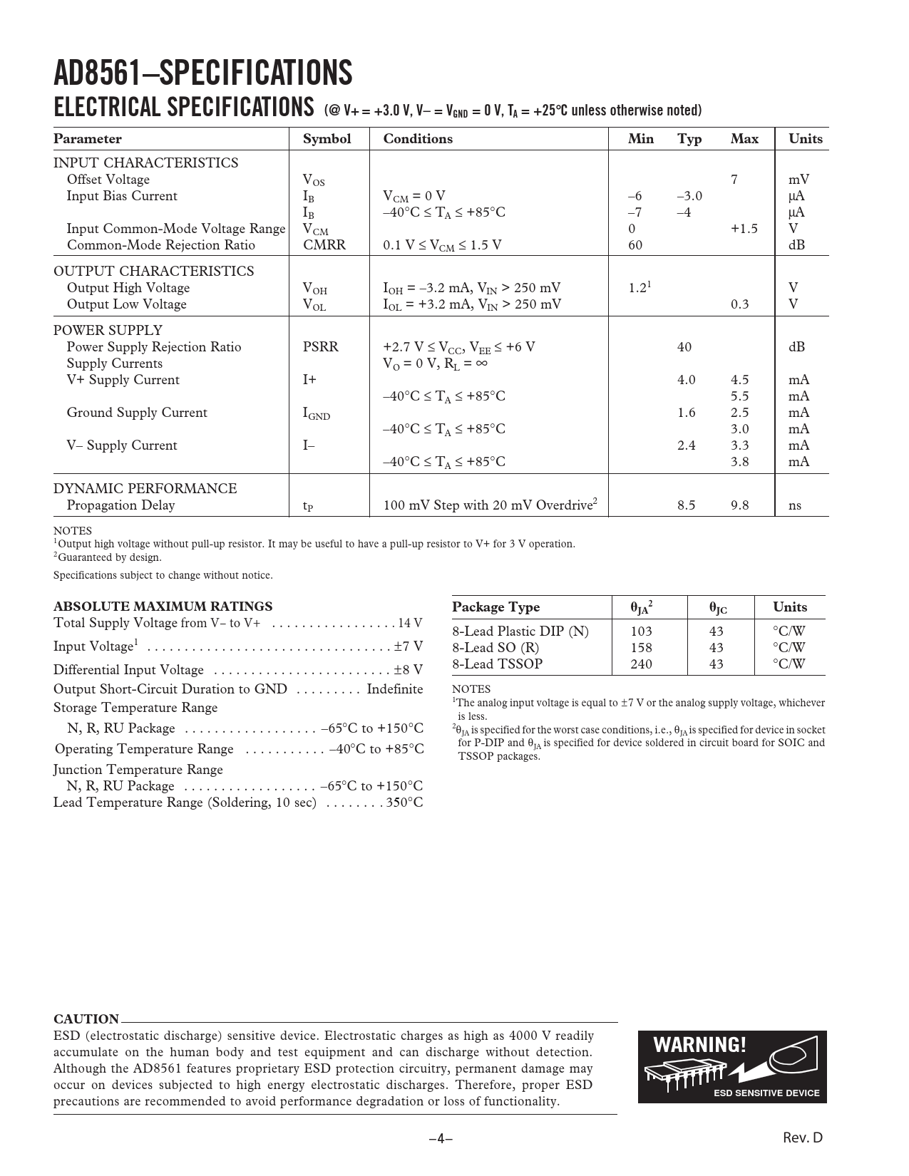 AD8561–SPECIFICATIONS ELECTRICAL SPECIFICATIONS (@ V+ = +3.0 V, V– = VGND = 0 V, TA = +25 ⴗ C unless otherwise noted)ParameterSymbolConditionsMinTypMaxUnits INPUT CHARACTERISTICS Offset Voltage VOS 7 mV Input Bias Current IB VCM = 0 V –6 –3.0 μA IB –40°C ≤ TA ≤ +85°C –7 –4 μA Input Common-Mode Voltage Range VCM 0 +1.5 V Common-Mode Rejection Ratio CMRR 0.1 V ≤ VCM ≤ 1.5 V 60 dB OUTPUT CHARACTERISTICS Output High Voltage VOH IOH = –3.2 mA, VIN > 250 mV 1.21 V Output Low Voltage VOL IOL = +3.2 mA, VIN > 250 mV 0.3 V POWER SUPPLY Power Supply Rejection Ratio PSRR +2.7 V ≤ VCC, VEE ≤ +6 V 40 dB Supply Currents VO = 0 V, RL = ∞ V+ Supply Current I+ 4.0 4.5 mA –40°C ≤ TA ≤ +85°C 5.5 mA Ground Supply Current IGND 1.6 2.5 mA –40°C ≤ TA ≤ +85°C 3.0 mA V– Supply Current I– 2.4 3.3 mA –40°C ≤ TA ≤ +85°C 3.8 mA DYNAMIC PERFORMANCE Propagation Delay tP 100 mV Step with 20 mV Overdrive2 8.5 9.8 ns NOTES 1Output high voltage without pull-up resistor. It may be useful to have a pull-up resistor to V+ for 3 V operation. 2Guaranteed by design. Specifications subject to change without notice. ABSOLUTE MAXIMUM RATINGSPackage Type 2JA JCUnits Total Supply Voltage from V– to V+ . 14 V 8-Lead Plastic DIP (N) 103 43 °C/W Input Voltage1 . ±7 V 8-Lead SO (R) 158 43 °C/W Differential Input Voltage . ±8 V 8-Lead TSSOP 240 43 °C/W Output Short-Circuit Duration to GND . Indefinite NOTES 1 Storage Temperature Range The analog input voltage is equal to ±7 V or the analog supply voltage, whichever is less. N, R, RU Package . –65°C to +150°C 2θJA is specified for the worst case conditions, i.e., θJA is specified for device in socket for P-DIP and θ Operating Temperature Range . –40°C to +85°C JA is specified for device soldered in circuit board for SOIC and TSSOP packages. Junction Temperature Range N, R, RU Package . –65°C to +150°C Lead Temperature Range (Soldering, 10 sec) . 350°C CAUTION ESD (electrostatic discharge) sensitive device. Electrostatic charges as high as 4000 V readily WARNING! accumulate on the human body and test equipment and can discharge without detection. Although the AD8561 features proprietary ESD protection circuitry, permanent damage may occur on devices subjected to high energy electrostatic discharges. Therefore, proper ESD ESD SENSITIVE DEVICE precautions are recommended to avoid performance degradation or loss of functionality. –4– Rev. D Document Outline Features Applications General Description Pin Configurations Specifications Electrical Specifications Absolute Maximum Ratings Typical Performance Characteristics Applications Optimizing High Speed Performance Replacing the LT1016 Increasing Output Swing Output Loading Considerations Setup and Hold Times for Latching the Output Input Stage and Bias Currents Using Hysteresis SPICE Model Outline Dimensions Ordering Guide Revision History