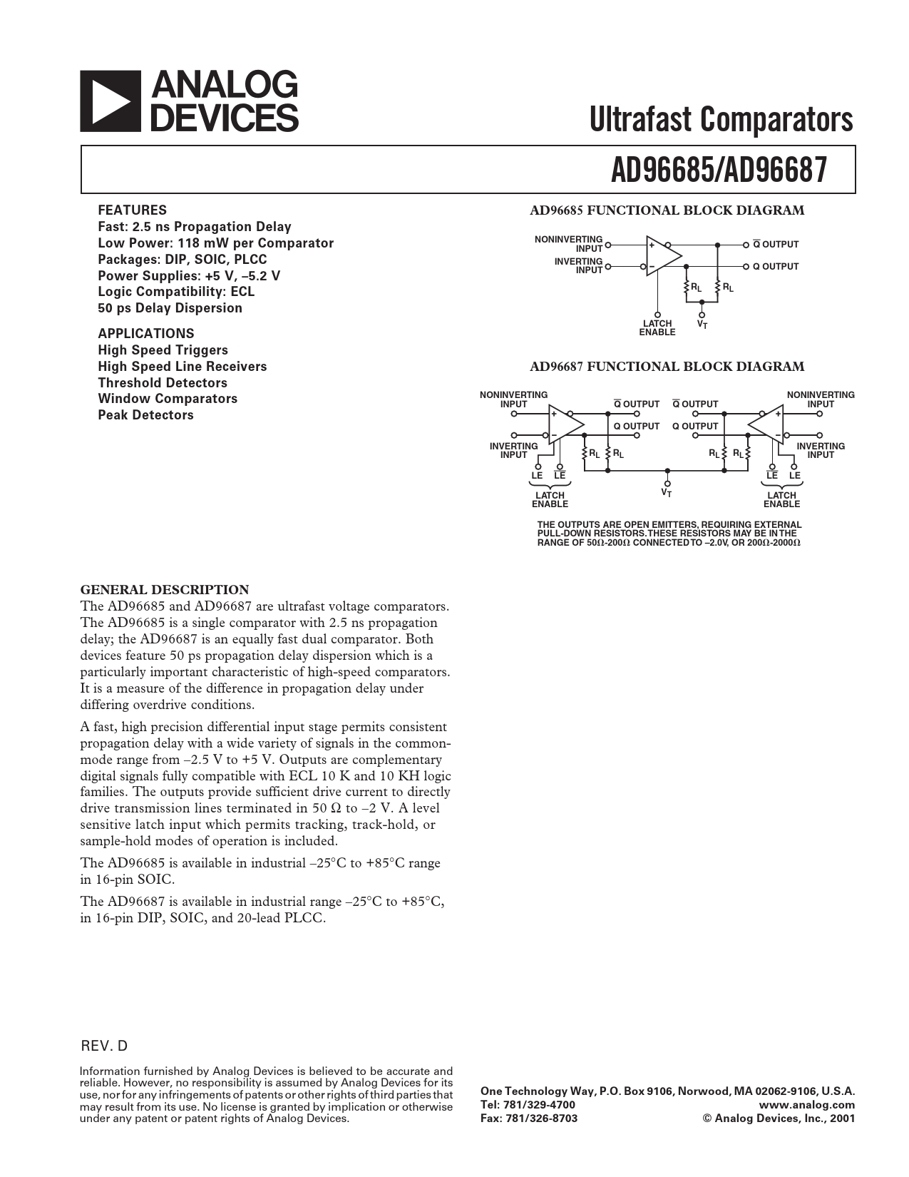 The AD96685 and AD96687 are ultrafast voltage comparators. The AD96685 is a single comparator with 2.5 ns propagation delay; the AD96687 is an equally fast dual comparator. Both devices feature 50 ps propagation delay dispersion which is a particularly important characteristic of high-speed comparators. It is a measure of the difference in propagation delay under differing overdrive conditions. A fast, high precision differential input stage permits consistent propagation delay with a wide variety of signals in the common- mode range from –2.5 V to +5 V. Outputs are complementary digital signals fully compatible with ECL 10 K and 10 KH logic families. The outputs provide sufficient drive current to directly drive transmission lines terminated in 50 Ω to –2 V. A level sensitive latch input which permits tracking, track-hold, or sample-hold modes of operation is included. The AD96685 is available in industrial –25°C to +85°C range in 16-pin SOIC. The AD96687 is available in industrial range –25°C to +85°C, in 16-pin DIP, SOIC, and 20-lead PLCC. REV. D Information furnished by Analog Devices is believed to be accurate and reliable. However, no responsibility is assumed by Analog Devices for its use, nor for any infringements of patents or other rights of third parties that