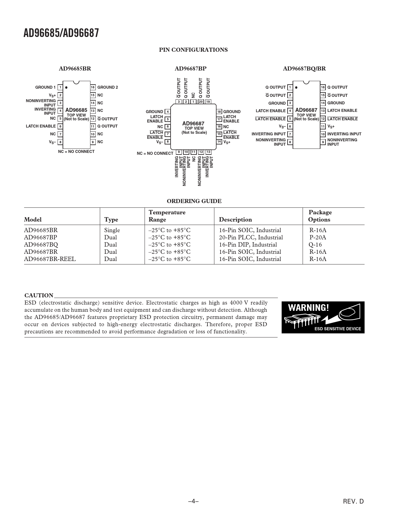 AD96685/AD96687. PIN CONFIGURATIONS. AD96685BR. AD96687BP. AD96687BQ/BR. GROUND 1. 16 GROUND 2. Q OUTPUT 1. 16 Q OUTPUT. OUTPUT. VS+ 2. 15 NC