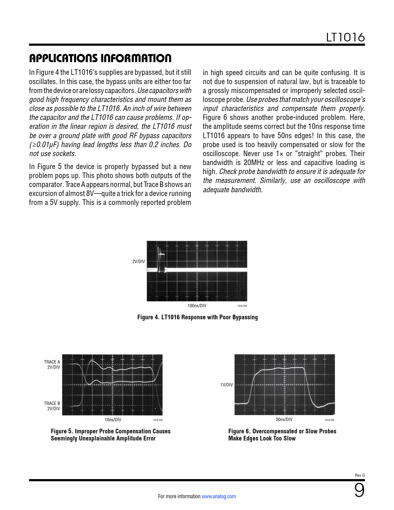 link to page 9 link to page 9 link to page 9 LT1016 APPLICATIONS INFORMATION In Figure 4 the LT1016’s supplies are bypassed, but it still in high speed circuits and can be quite confusing. It is oscillates. In this case, the bypass units are either too far not due to suspension of natural law, but is traceable to from the device or are lossy capacitors. Use capacitors with a grossly miscompensated or improperly selected oscil- good high frequency characteristics and mount them as loscope probe. Use probes that match your oscilloscope’s close as possible to the LT1016. An inch of wire between input characteristics and compensate them properly. the capacitor and the LT1016 can cause problems. If op- Figure 6 shows another probe-induced problem. Here, eration in the linear region is desired, the LT1016 must the amplitude seems correct but the 10ns response time be over a ground plate with good RF bypass capacitors LT1016 appears to have 50ns edges! In this case, the (≥0.01µF) having lead lengths less than 0.2 inches. Do probe used is too heavily compensated or slow for the not use sockets. oscilloscope. Never use 1× or “straight” probes. Their In Figure 5 the device is properly bypassed but a new bandwidth is 20MHz or less and capacitive loading is problem pops up. This photo shows both outputs of the high. Check probe bandwidth to ensure it is adequate for comparator. Trace A appears normal, but Trace B shows an the measurement. Similarly, use an oscilloscope with excursion of almost 8V—quite a trick for a device running adequate bandwidth. from a 5V supply. This is a commonly reported problem 2V/DIV 100ns/DIV 1016 F04 Figure 4. LT1016 Response with Poor Bypassing TRACE A 2V/DIV 1V/DIV TRACE B 2V/DIV 10ns/DIV 1016 F05 50ns/DIV 1016 F06 Figure 5. Improper Probe Compensation CausesFigure 6. Overcompensated or Slow ProbesSeemingly Unexplainable Amplitude ErrorMake Edges Look Too Slow Rev D For more information www.analog.com 9 Document Outline Features Applications Description Typical Application Absolute Maximum Ratings Pin Configuration Order Information Electrical Characteristics Typical Performance Characteristics Applications Information Typical Applications Appendix A Package Description Revision History Applications Information Related Parts