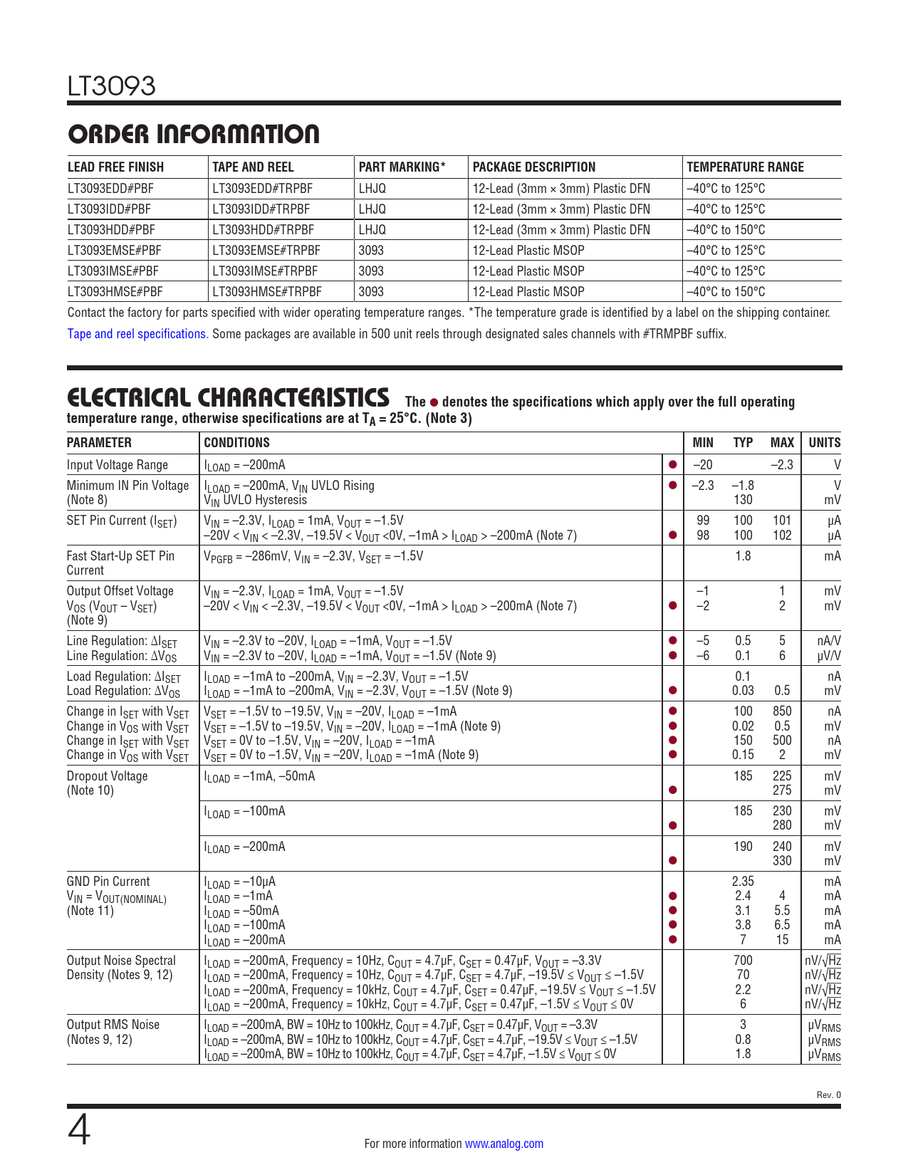 LT3093EDD#PBF LT3093EDD#TRPBF LHJQ 12-Lead (3mm × 3mm) Plastic DFN –40°C to 125°C LT3093IDD#PBF LT3093IDD#TRPBF LHJQ 12-Lead (3mm × 3mm) Plastic DFN –40°C to 125°C LT3093HDD#PBF LT3093HDD#TRPBF LHJQ 12-Lead (3mm × 3mm) Plastic DFN –40°C to 150°C LT3093EMSE#PBF LT3093EMSE#TRPBF 3093 12-Lead Plastic MSOP –40°C to 125°C LT3093IMSE#PBF LT3093IMSE#TRPBF 3093 12-Lead Plastic MSOP –40°C to 125°C LT3093HMSE#PBF LT3093HMSE#TRPBF 3093 12-Lead Plastic MSOP –40°C to 150°C Contact the factory for parts specified with wider operating temperature ranges. *The temperature grade is identified by a label on the shipping container. Tape and reel specifications. Some packages are available in 500 unit reels through designated sales channels with #TRMPBF suffix.