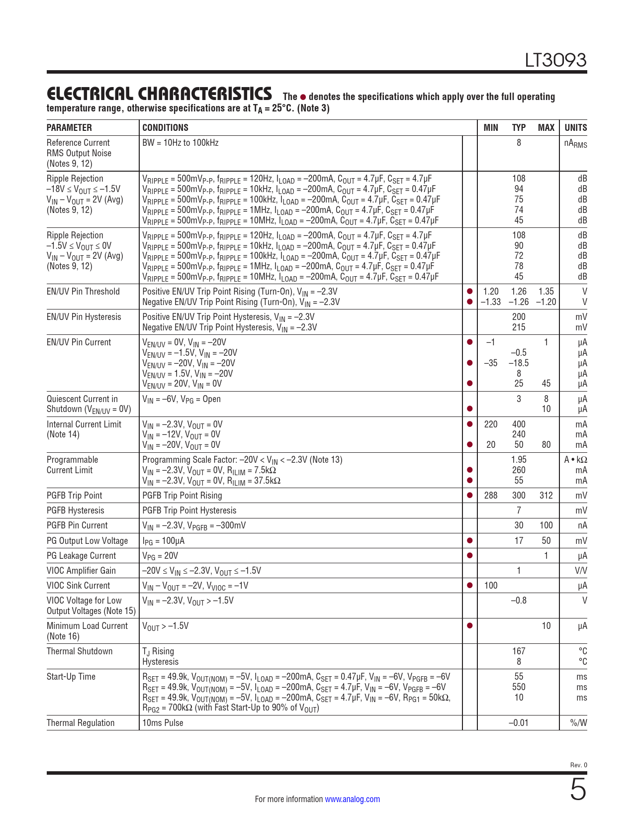 Reference Current BW = 10Hz to 100kHz 8 nARMS RMS Output Noise (Notes 9, 12) Ripple Rejection VRIPPLE = 500mVP-P, fRIPPLE = 120Hz, ILOAD = –200mA, COUT = 4.7µF, CSET = 4.7µF 108 dB –18V ≤ VOUT ≤ –1.5V VRIPPLE = 500mVP-P, fRIPPLE = 10kHz, ILOAD = –200mA, COUT = 4.7µF, CSET = 0.47µF 94 dB VIN – VOUT = 2V (Avg) VRIPPLE = 500mVP-P, fRIPPLE = 100kHz, ILOAD = –200mA, COUT = 4.7µF, CSET = 0.47µF 75 dB (Notes 9, 12) VRIPPLE = 500mVP-P, fRIPPLE = 1MHz, ILOAD = –200mA, COUT = 4.7µF, CSET = 0.47µF 74 dB VRIPPLE = 500mVP-P, fRIPPLE = 10MHz, ILOAD = –200mA, COUT = 4.7µF, CSET = 0.47µF 45 dB Ripple Rejection VRIPPLE = 500mVP-P, fRIPPLE = 120Hz, ILOAD = –200mA, COUT = 4.7µF, CSET = 4.7µF 108 dB –1.5V ≤ VOUT ≤ 0V VRIPPLE = 500mVP-P, fRIPPLE = 10kHz, ILOAD = –200mA, COUT = 4.7µF, CSET = 0.47µF 90 dB VIN – VOUT = 2V (Avg) VRIPPLE = 500mVP-P, fRIPPLE = 100kHz, ILOAD = –200mA, COUT = 4.7µF, CSET = 0.47µF 72 dB (Notes 9, 12) VRIPPLE = 500mVP-P, fRIPPLE = 1MHz, ILOAD = –200mA, COUT = 4.7µF, CSET = 0.47µF 78 dB VRIPPLE = 500mVP-P, fRIPPLE = 10MHz, ILOAD = –200mA, COUT = 4.7µF, CSET = 0.47µF 45 dB EN/UV Pin Threshold Positive EN/UV Trip Point Rising (Turn-On), VIN = –2.3V l 1.20 1.26 1.35 V Negative EN/UV Trip Point Rising (Turn-On), VIN = –2.3V l –1.33 –1.26 –1.20 V EN/UV Pin Hysteresis Positive EN/UV Trip Point Hysteresis, VIN = –2.3V 200 mV Negative EN/UV Trip Point Hysteresis, VIN = –2.3V 215 mV EN/UV Pin Current VEN/UV = 0V, VIN = –20V l –1 1 µA VEN/UV = –1.5V, VIN = –20V –0.5 µA VEN/UV = –20V, VIN = –20V l –35 –18.5 µA VEN/UV = 1.5V, VIN = –20V 8 µA VEN/UV = 20V, VIN = 0V l 25 45 µA Quiescent Current in VIN = –6V, VPG = Open 3 8 µA Shutdown (VEN/UV = 0V) l 10 µA Internal Current Limit VIN = –2.3V, VOUT = 0V l 220 400 mA (Note 14) VIN = –12V, VOUT = 0V 240 mA VIN = –20V, VOUT = 0V l 20 50 80 mA Programmable Programming Scale Factor: –20V < VIN < –2.3V (Note 13) 1.95 A • kΩ Current Limit VIN = –2.3V, VOUT = 0V, RILIM = 7.5kΩ l 260 mA VIN = –2.3V, VOUT = 0V, RILIM = 37.5kΩ l 55 mA PGFB Trip Point PGFB Trip Point Rising l 288 300 312 mV PGFB Hysteresis PGFB Trip Point Hysteresis 7 mV PGFB Pin Current VIN = –2.3V, VPGFB = –300mV 30 100 nA PG Output Low Voltage IPG = 100µA l 17 50 mV PG Leakage Current VPG = 20V l 1 µA VIOC Amplifier Gain –20V ≤ VIN ≤ –2.3V, VOUT ≤ –1.5V 1 V/V VIOC Sink Current VIN – VOUT = –2V, VVIOC = –1V l 100 µA VIOC Voltage for Low VIN = –2.3V, VOUT > –1.5V –0.8 V Output Voltages (Note 15) Minimum Load Current VOUT > –1.5V l 10 µA (Note 16) Thermal Shutdown TJ Rising 167 °C Hysteresis 8 °C Start-Up Time RSET = 49.9k, VOUT(NOM) = –5V, ILOAD = –200mA, CSET = 0.47µF, VIN = –6V, VPGFB = –6V 55 ms RSET = 49.9k, VOUT(NOM) = –5V, ILOAD = –200mA, CSET = 4.7µF, VIN = –6V, VPGFB = –6V 550 ms RSET = 49.9k, VOUT(NOM) = –5V, ILOAD = –200mA, CSET = 4.7µF, VIN = –6V, RPG1 = 50kΩ, 10 ms RPG2 = 700kΩ (with Fast Start-Up to 90% of VOUT) Thermal Regulation 10ms Pulse –0.01 %/W Rev. 0 For more information www.analog.com 5 Document Outline Features Applications Typical Application Description Absolute Maximum Ratings Pin Configuration Order Information Electrical Characteristics Typical Performance Characteristics Pin Functions Block Diagram Applications Information Typical Application Package Description Typical Application Related Parts